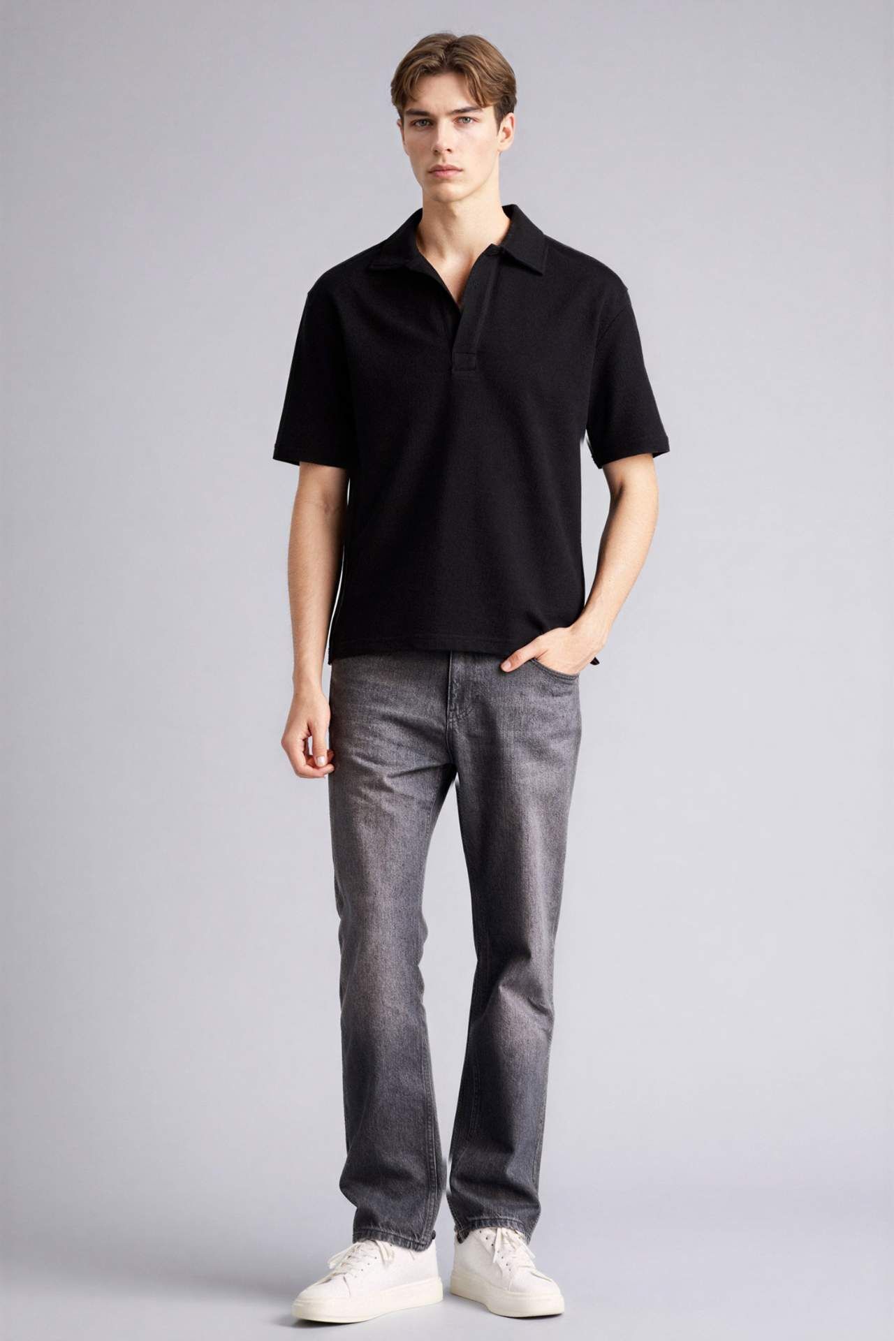 Boxy Fit Polo Yaka Kısa Kollu Polo Tişört, rahat kesimi ve nefes alabilen keten karışımlı yapısıyla sıcak havalarda ferah bir kullanım sunar. Polo yaka detayı şık bir görünüm kazandırırken, dokulu kumaşı stile modern bir dokunuş katar. Günlük kombinler için ideal bir tercihtir. Pamuk 45%,Poliester 55% Manken Bedeni: Göğüs: 77 Boy: 1,87 Basen: 93 Bel: 95