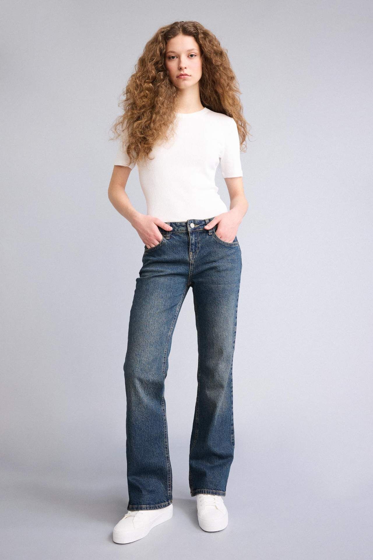Düşük Bel Uzun Jean Yıkamalı Pantolon
