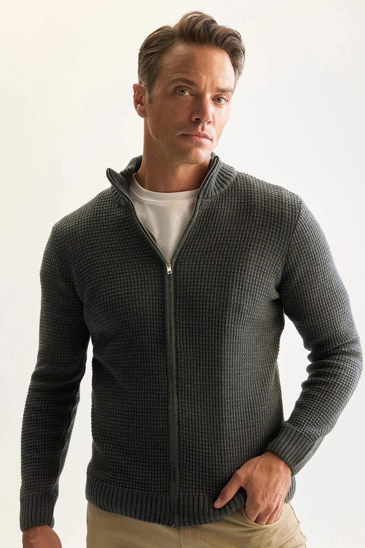 DeFacto Erkek Antrasit Standart Fit Normal Kesim Yarım Balıkçı Yaka Fermuarlı Waffle Hırka