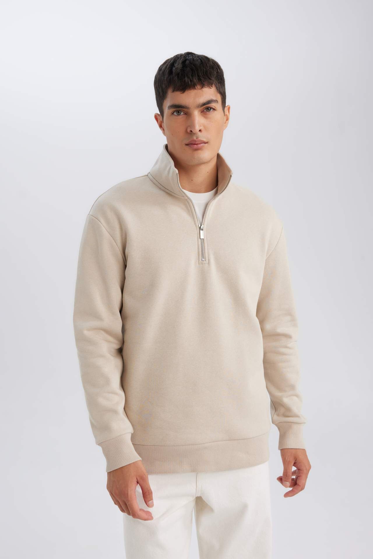 DeFacto Erkek Bej 3 İplik Pamuklu Şardonlu İçi Polarlı Comfort Regular Fit Rahat Kalıp Dik Yaka Fermuarlı Kalın Sweatshirt