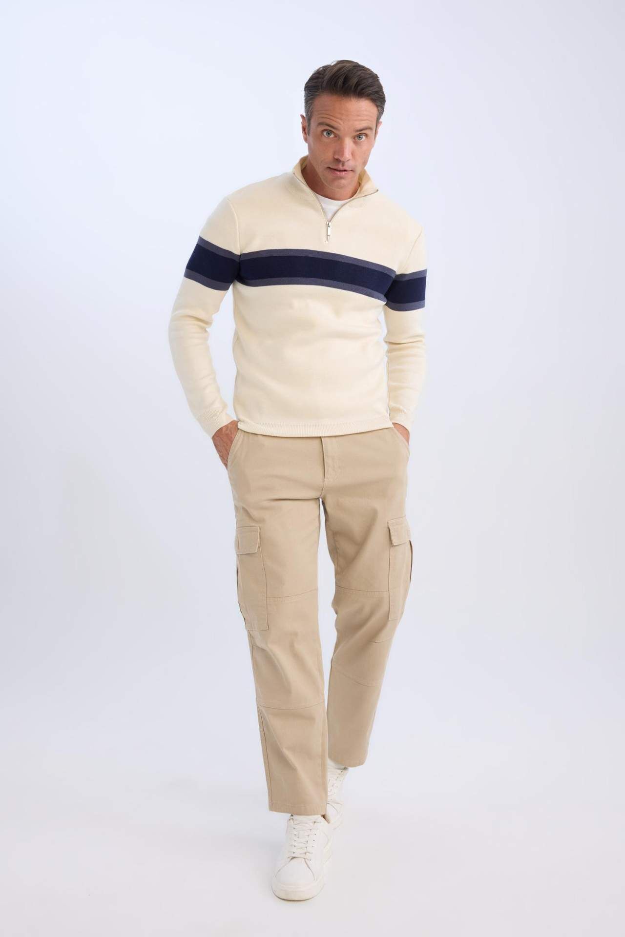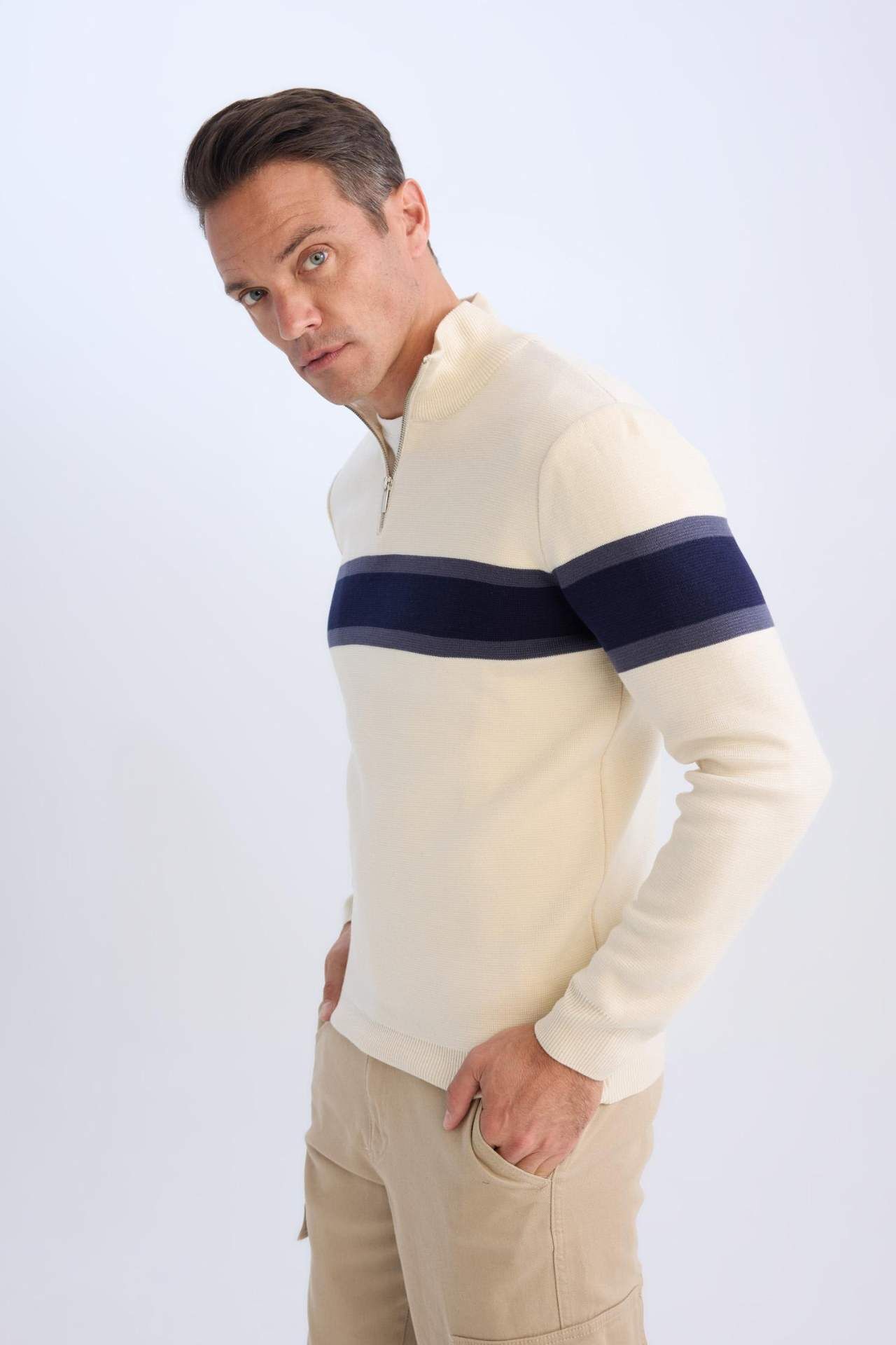 DeFacto Erkek Bej Standart Fit Normal Kesim Balıkçı Yaka Yarı Fermuarlı Çizgili Triko Kazak
