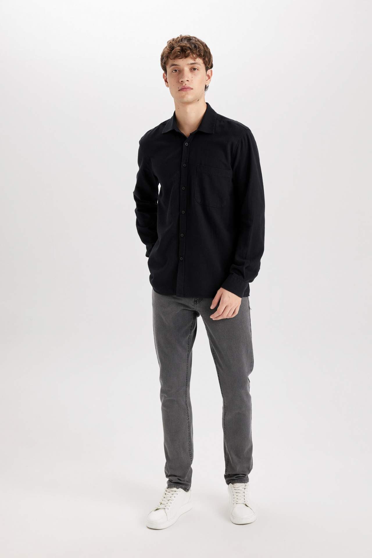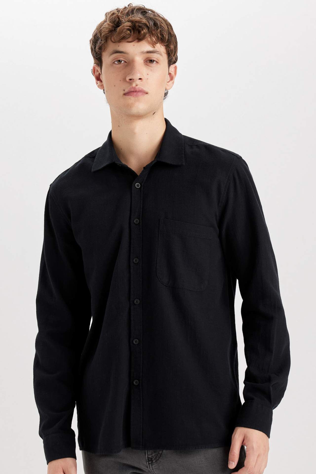 DeFacto Erkek Beyaz Regular Fit Normal Kesim Pamuklu Basic Düz Uzun Kollu Siyah Gömlek