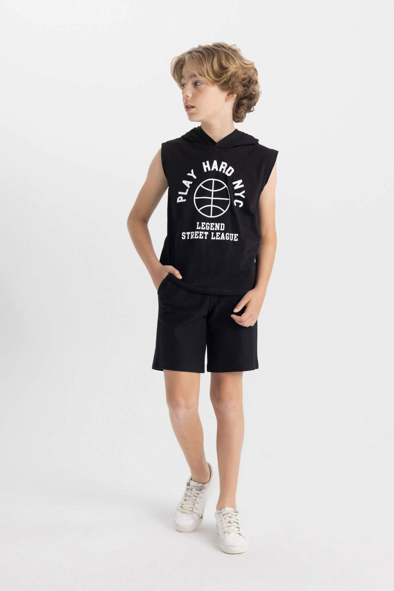 DeFactoFit Erkek Çocuk Baskılı Kolsuz Kapüşonlu Tişört Şort 2'li Takım