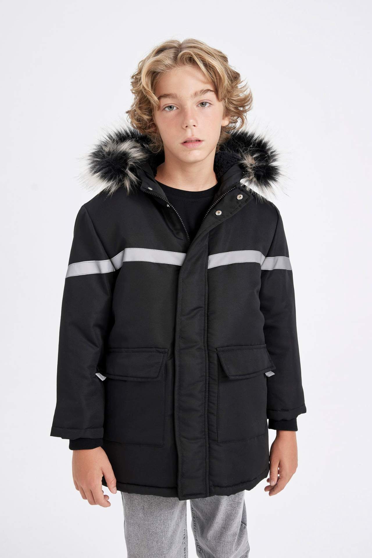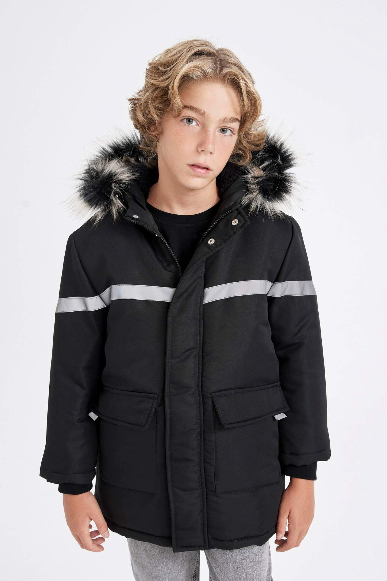 DeFacto Erkek Çocuk Çıkarılabilir Suni Kürk Yaka Kapüşonlu Pelüş Astar Parka C8786A824WNBK27