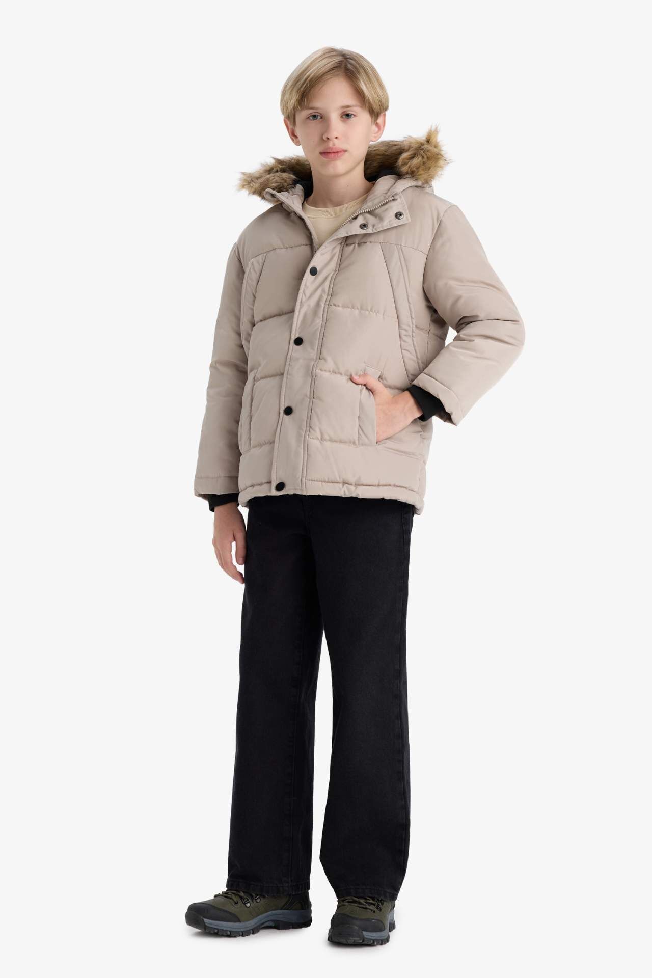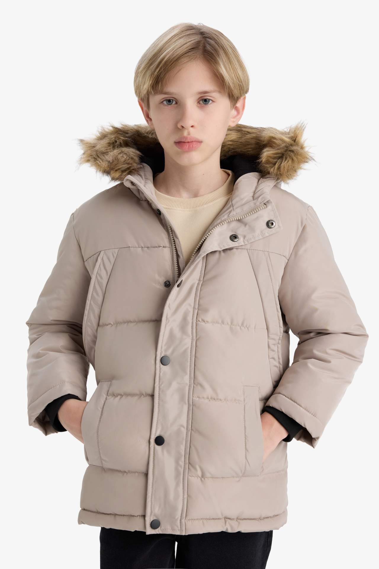 Erkek Çocuk Çıkarılabilir Suni Kürk Yaka Kapüşonlu Polar Astarlı Mont