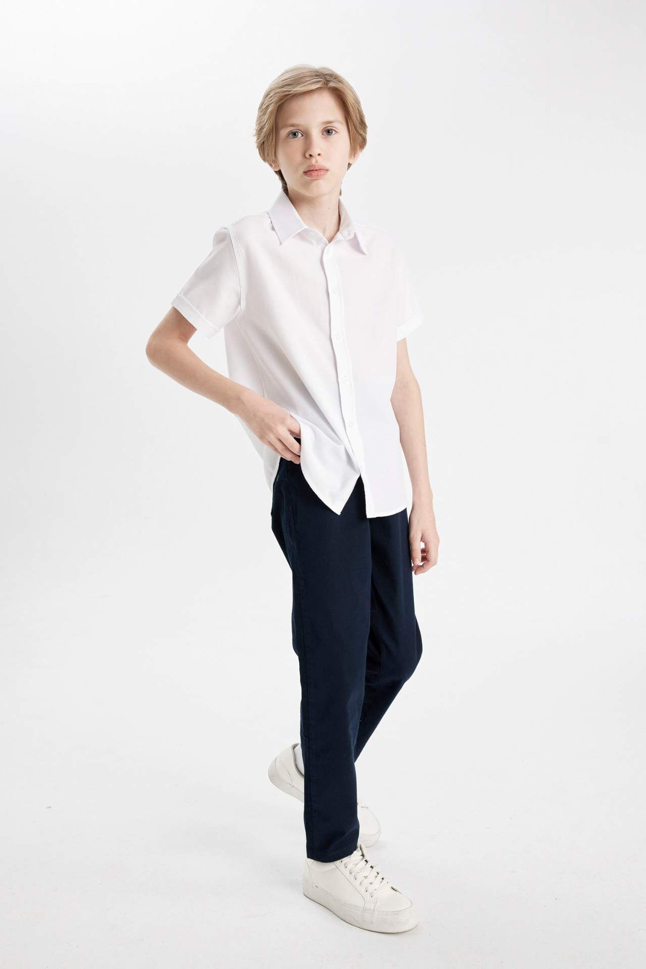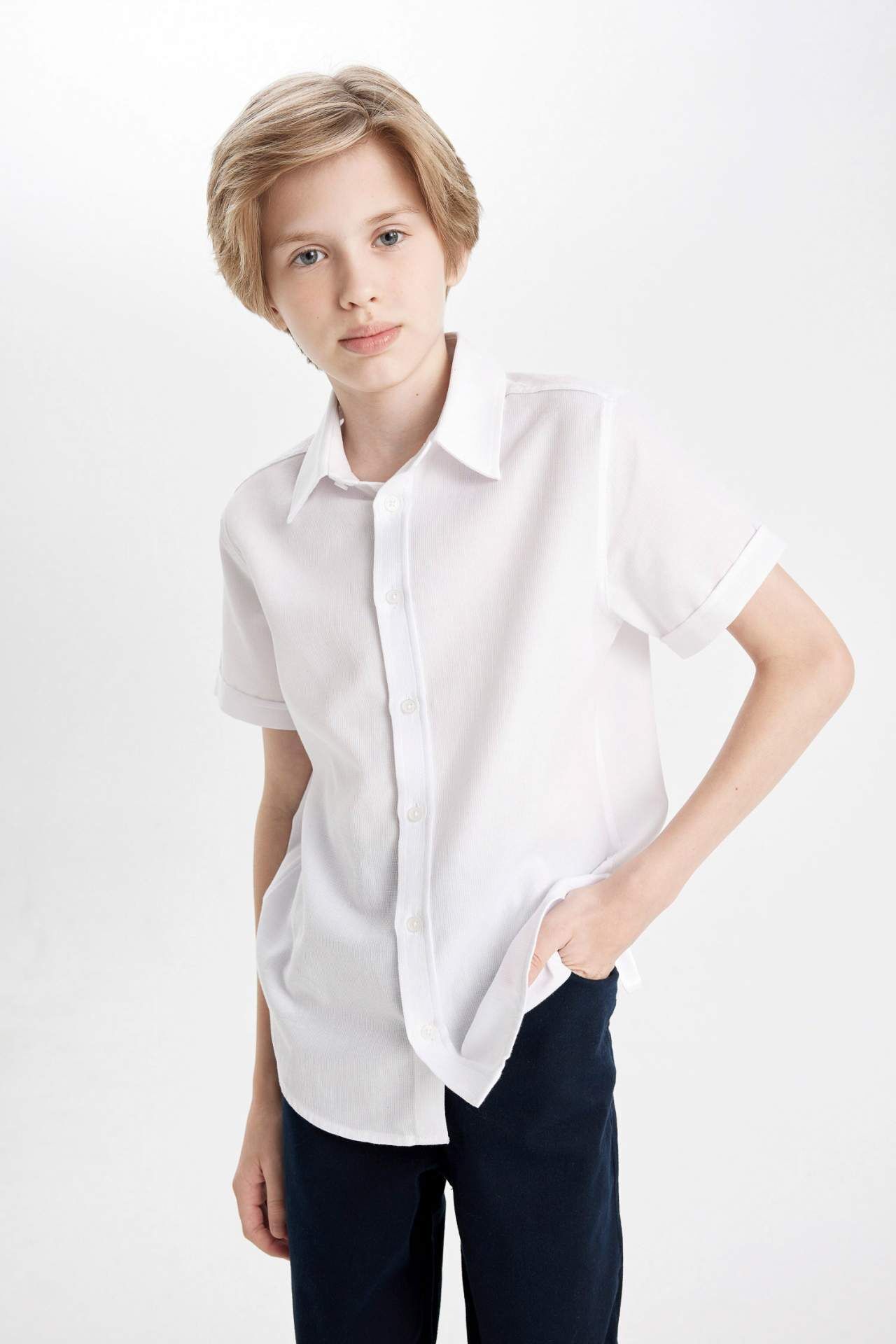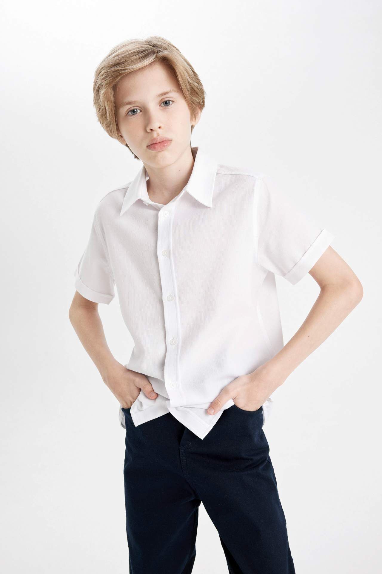 DeFacto DeFactoFit Erkek Çocuk Dokulu Beyaz Kısa Kollu Okul Gömleği