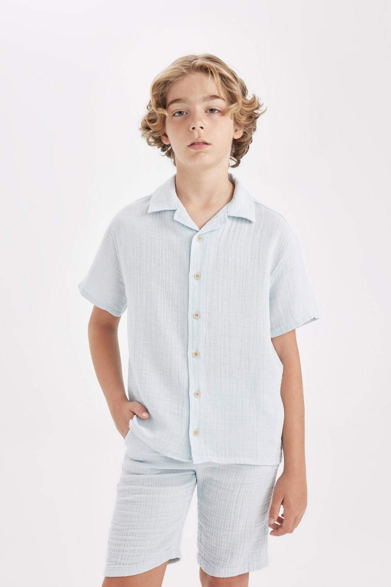 DeFactoFit Erkek Çocuk Oversize Fit Polo Yaka Müslin Kısa Kollu Gömlek W3239A624HSBE61