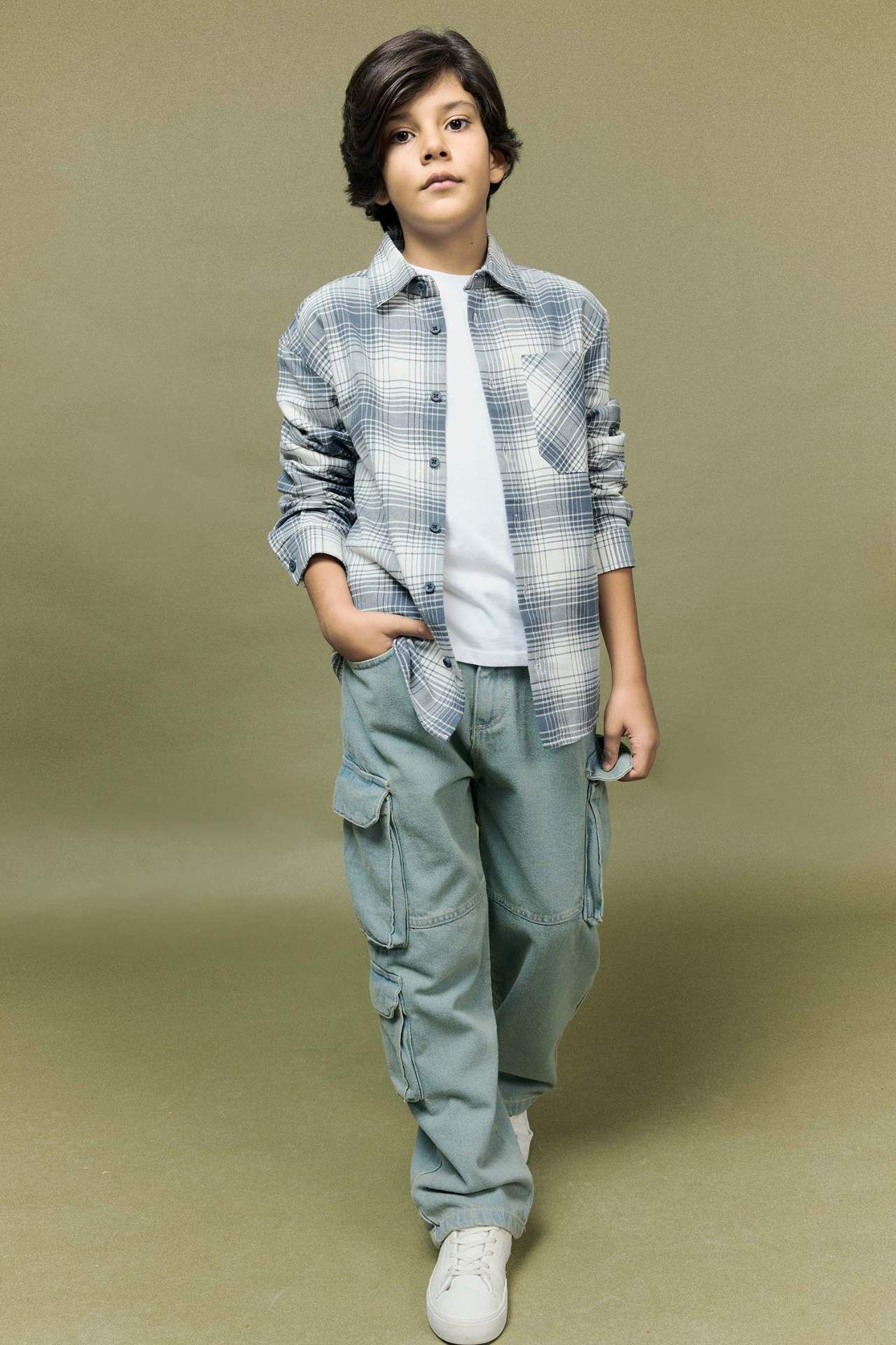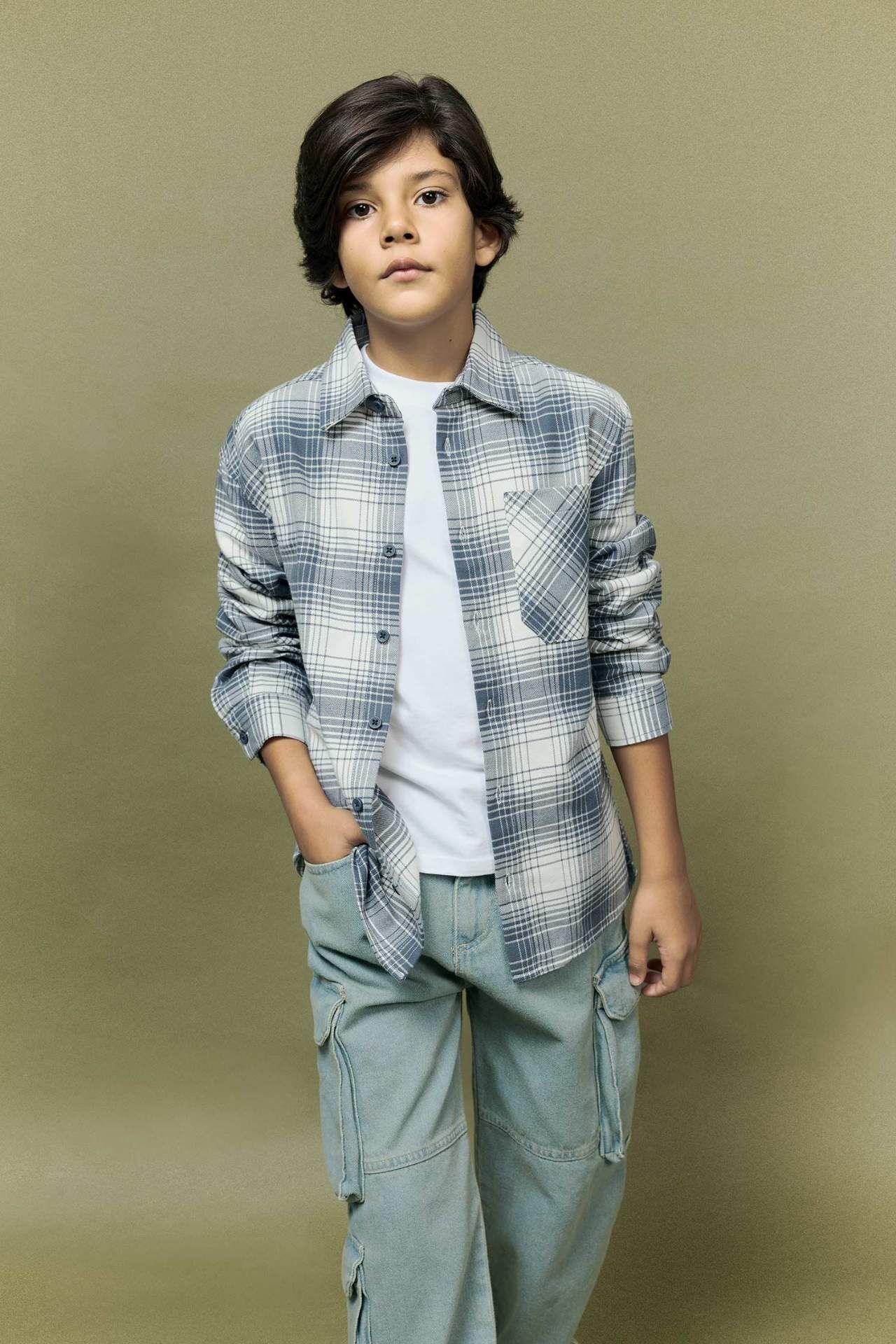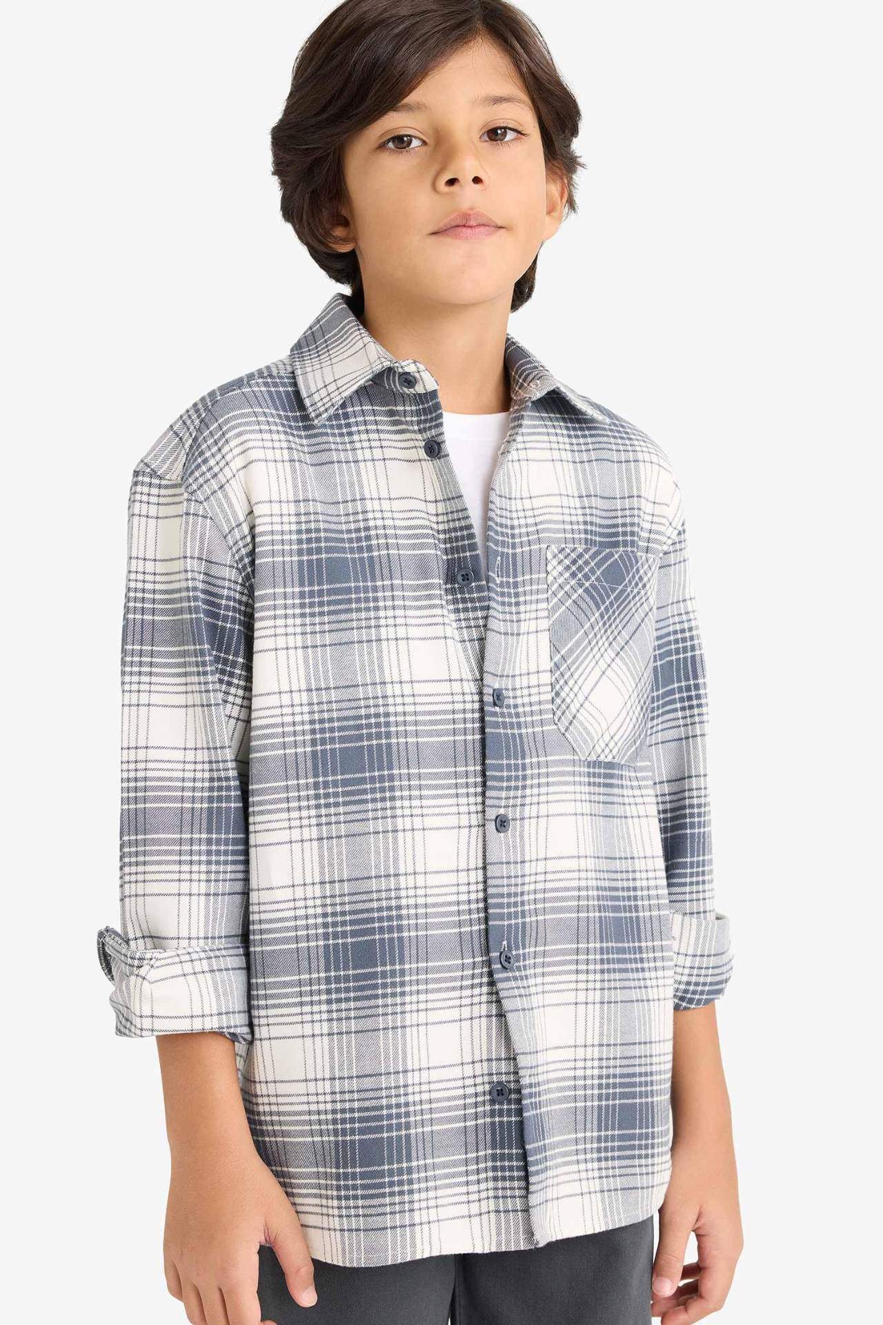 Erkek Çocuk Oversize Geniş Kalıp Polo Yaka Kareli Flanel Uzun Kollu Gömlek