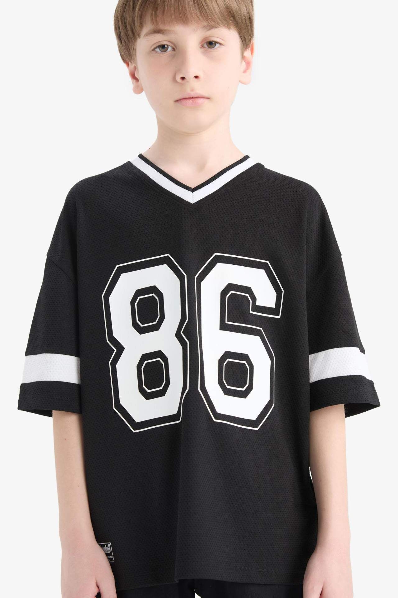 DeFacto Erkek Çocuk Oversize Geniş Kalıp V Yaka Üniversite Baskılı Tül Kısa Kollu Tişört F2412A825HSBK81