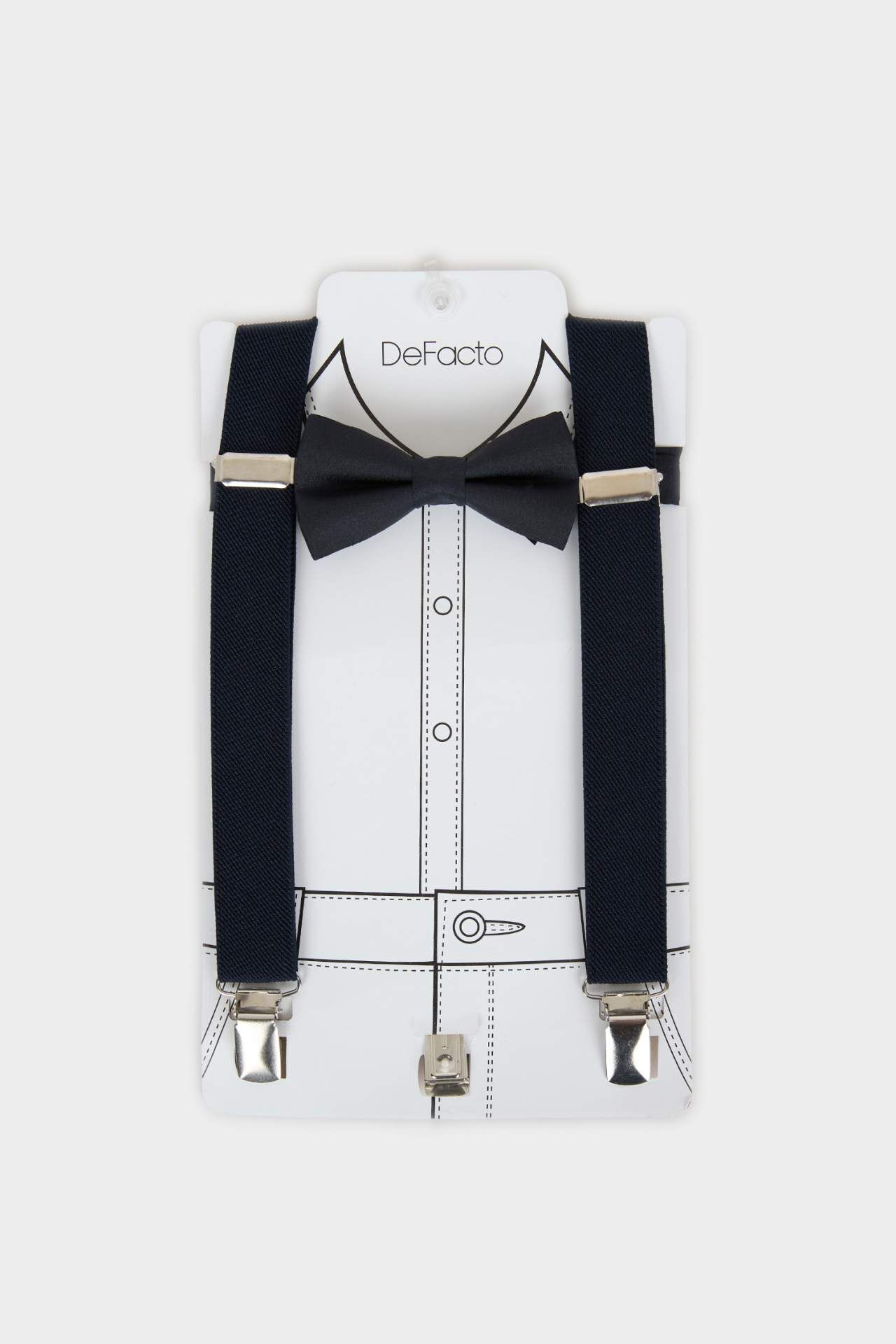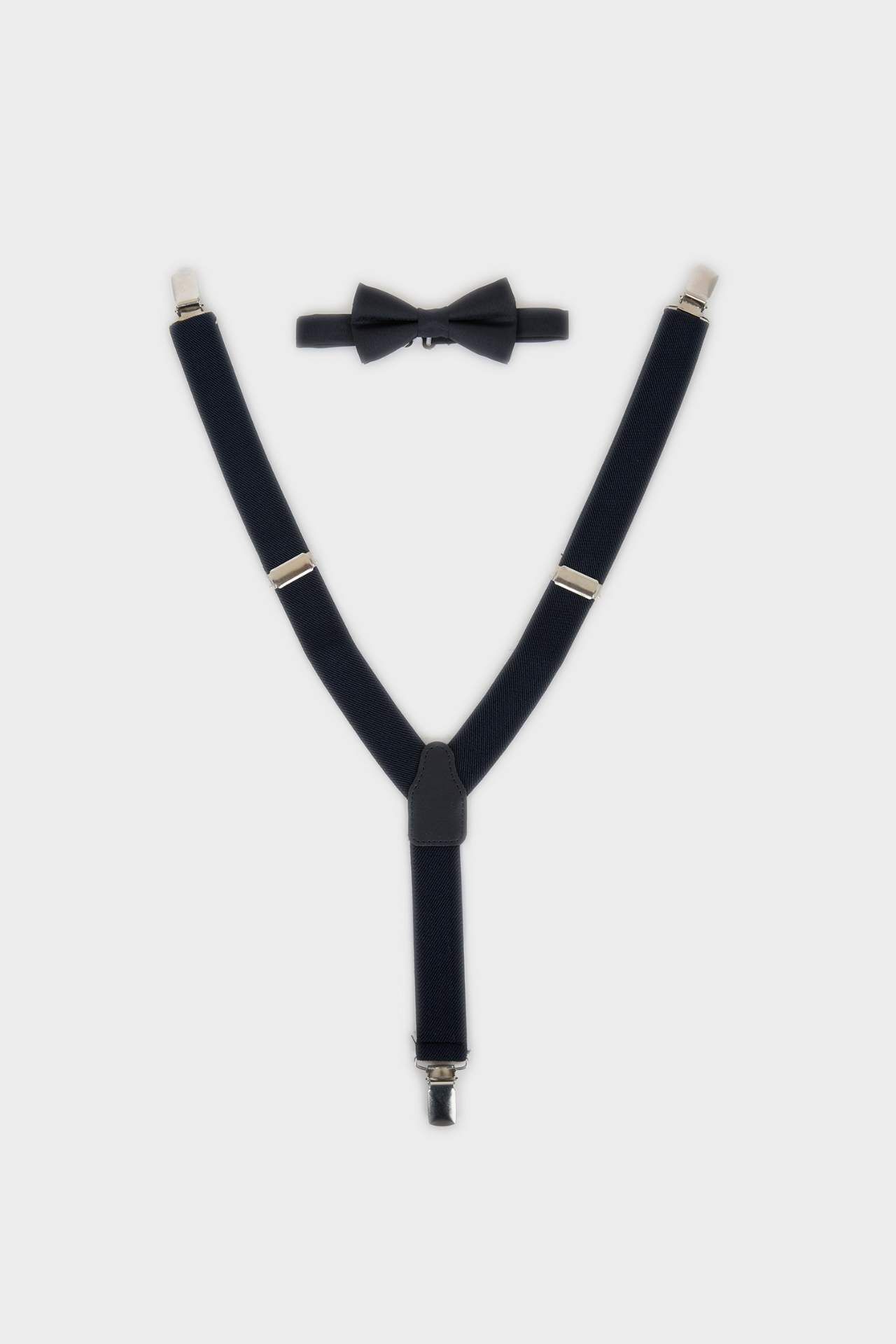 Pamuklu kumaştan üretilen papyon ve pantolon askısı seti, şık ve klasik bir görünüm sunar. Yumuşak ve hafif yapısıyla konfor sağlar, özel gün kombinlerini tamamlar. Poliester 76%,Elastodien 24%,Poliester 100%