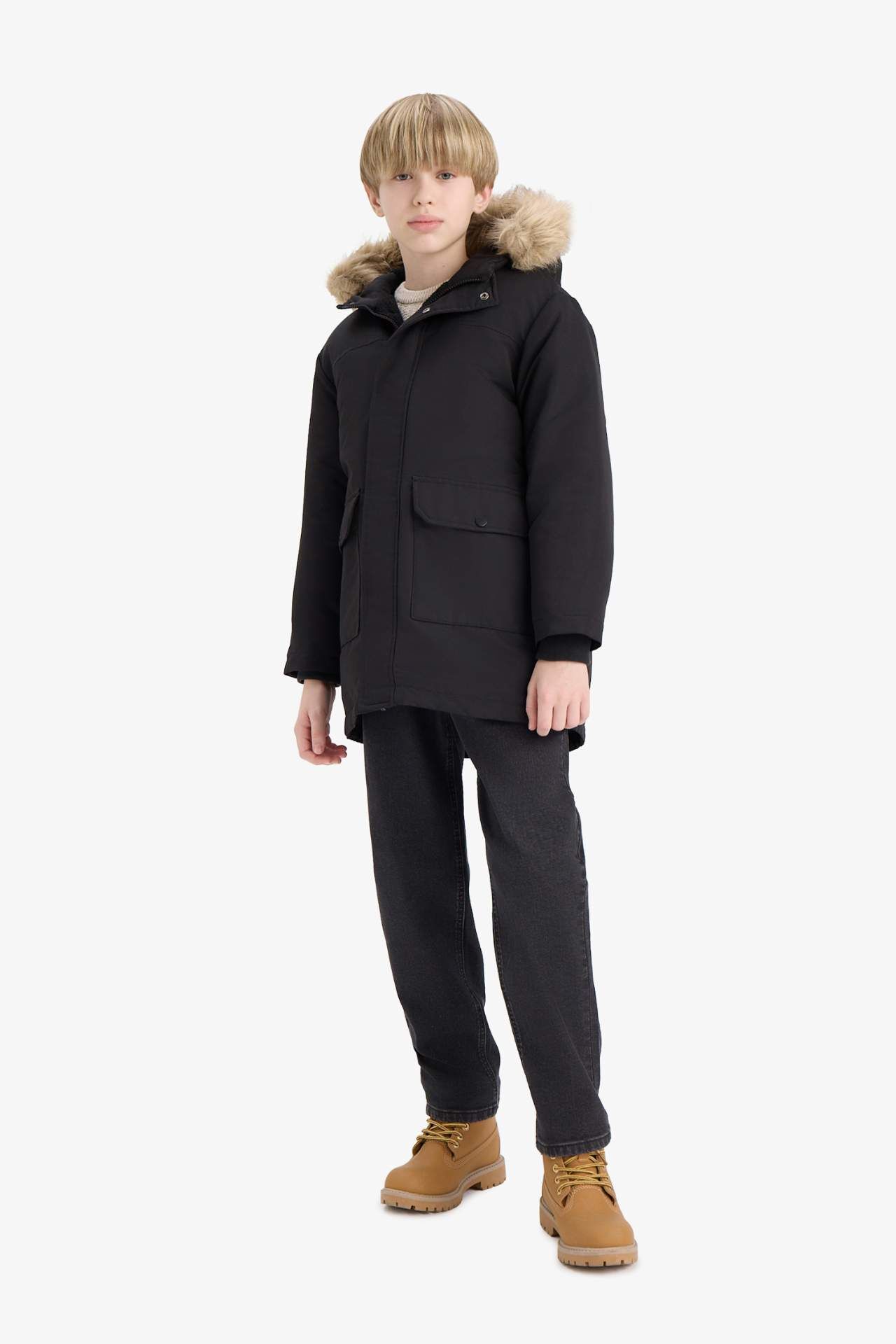 Erkek Çocuk Parka Mont Çıkarılabilir Suni Kürk Yaka Kapüşonlu Pelüş Astar