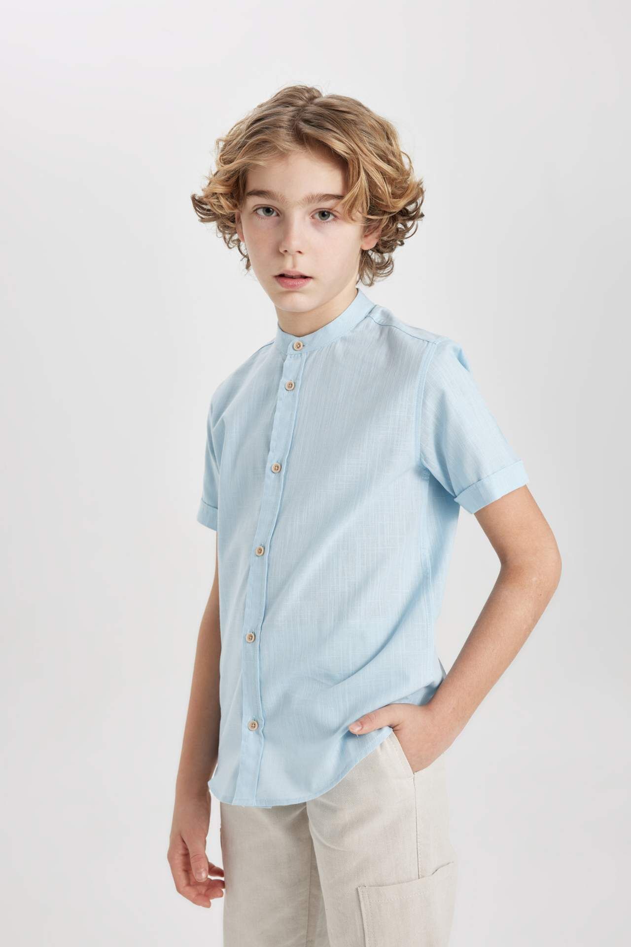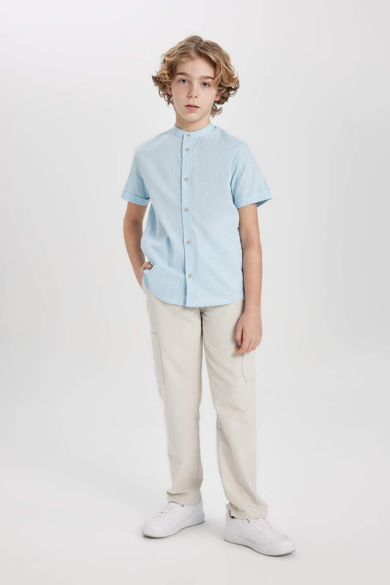 DeFacto Erkek Çocuk Regular Fit Dik Yaka Keten Görünümlü Kısa Kollu Gömlek