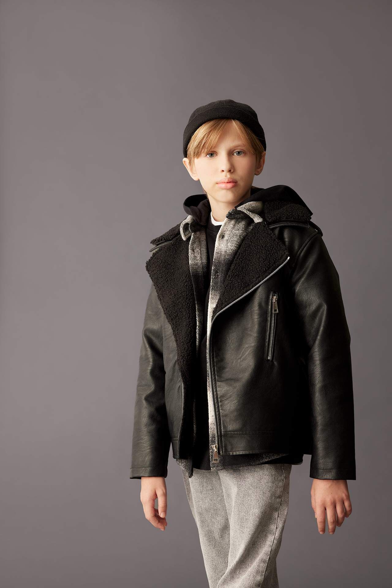 DeFacto Erkek Çocuk Su İtici Fermuarlı Yaka Pelüş Astar Suni Deri Ceket Mont