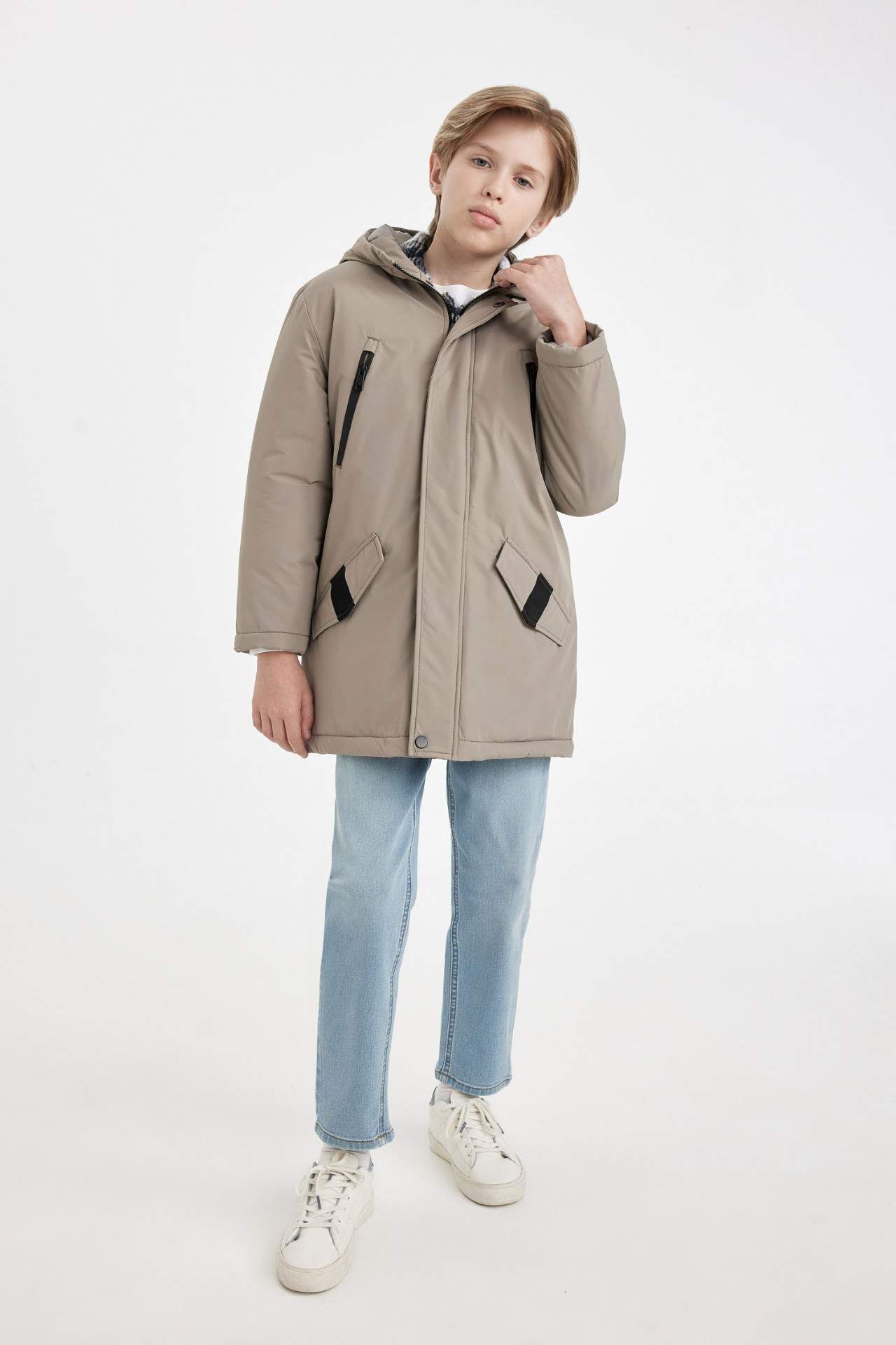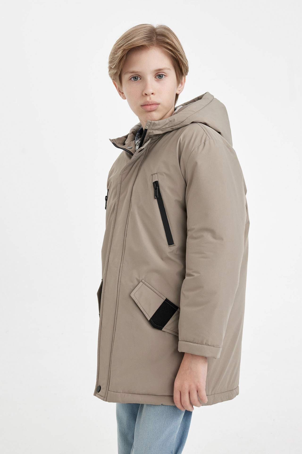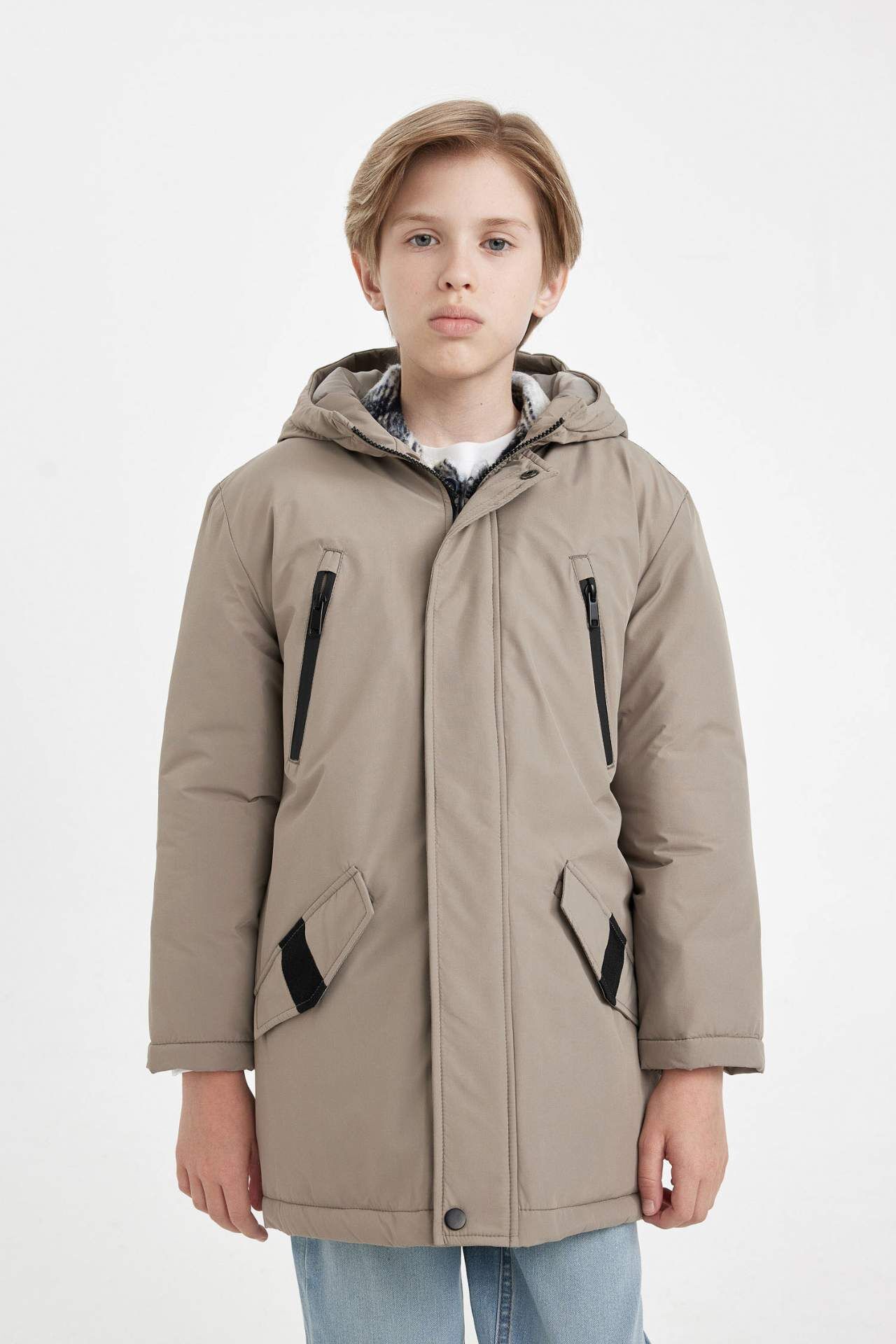 DeFacto Erkek Çocuk Su İtici Kapüşonlu Fermuar Çıtçıt Kapamalı Cift Cepli Parka Mont
