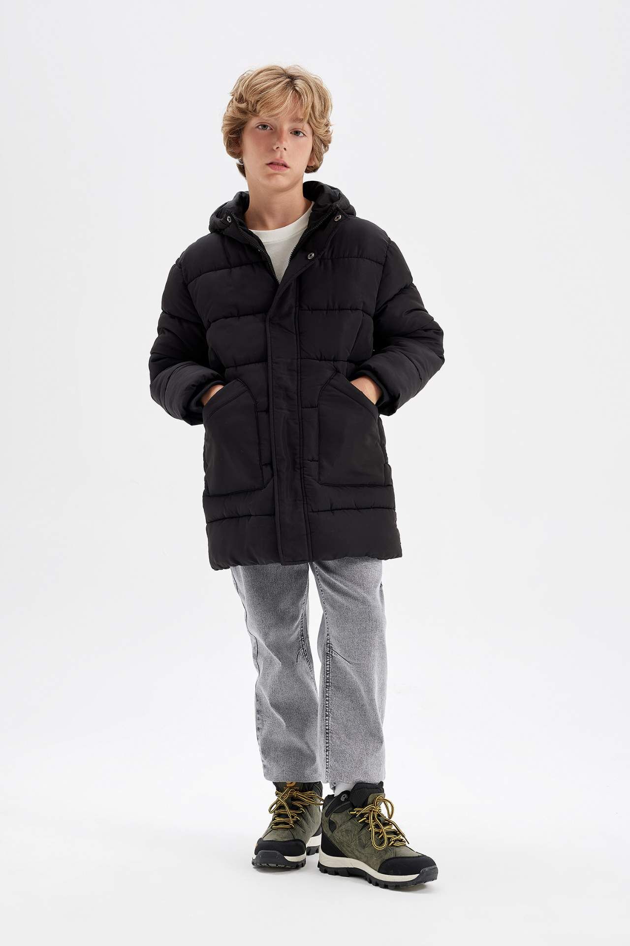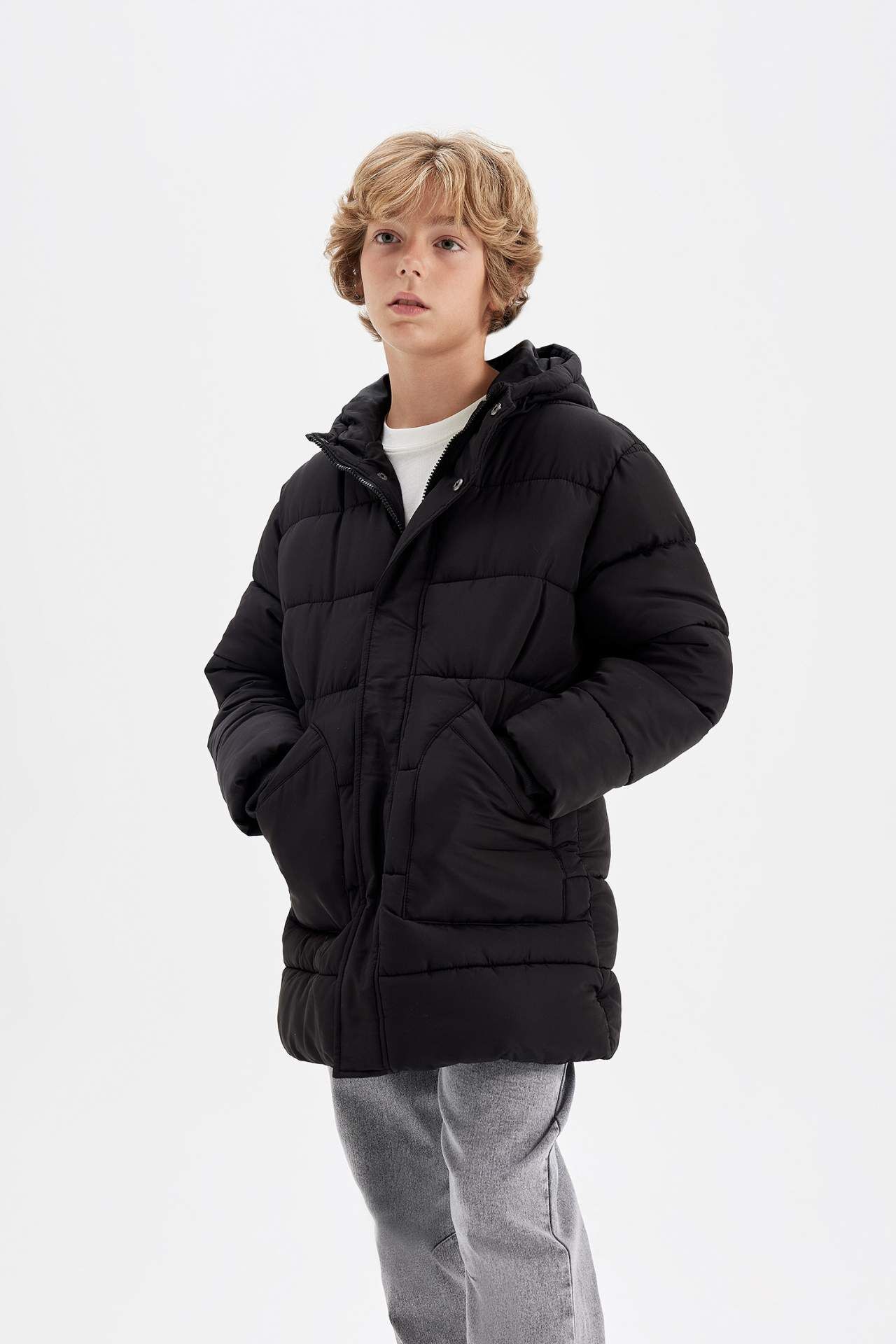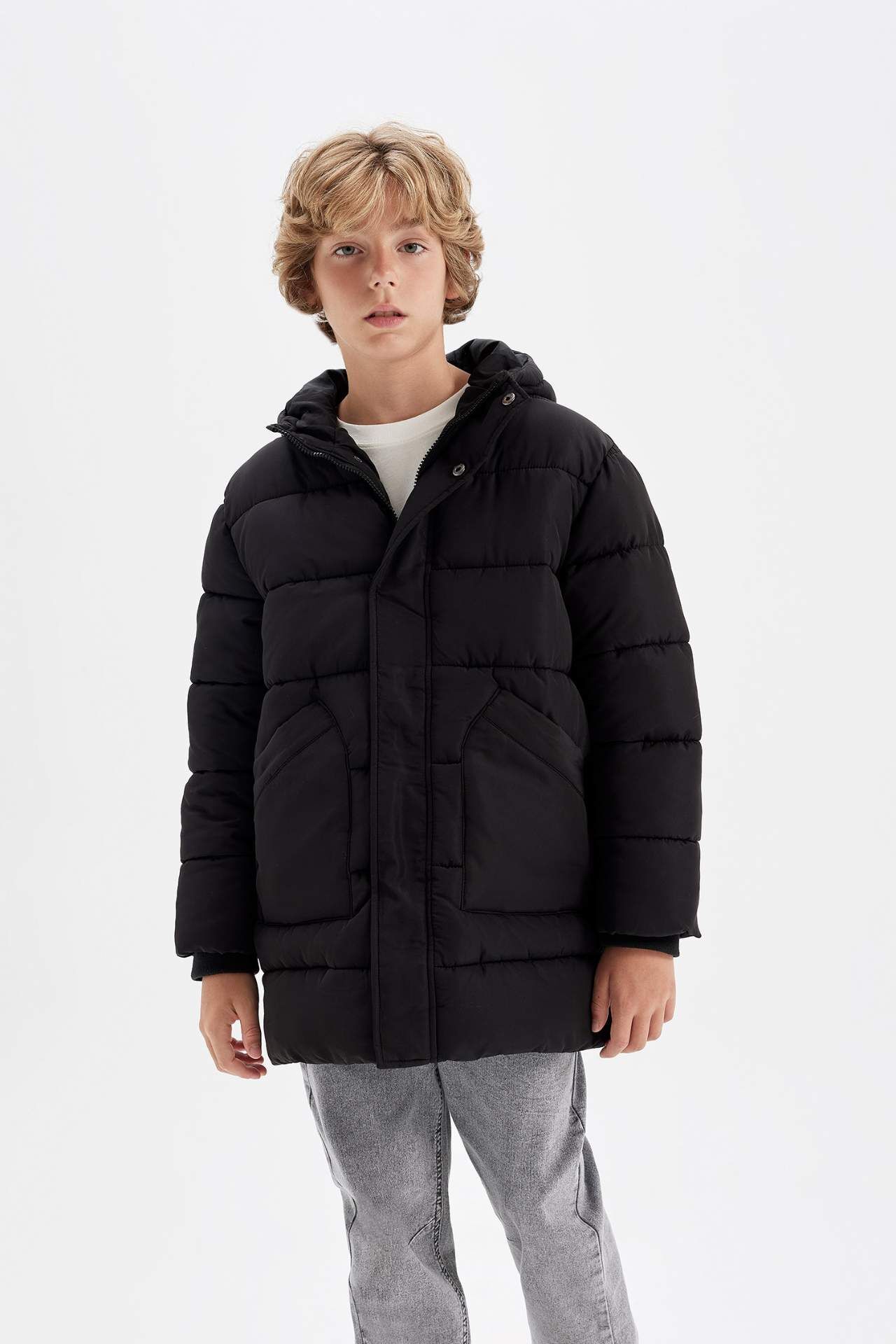 DeFacto Erkek Çocuk Su İtici Kapüşonlu Fermuarlı Çıtçıt Kapamalı Cepli Parka C8782A824WNBK27