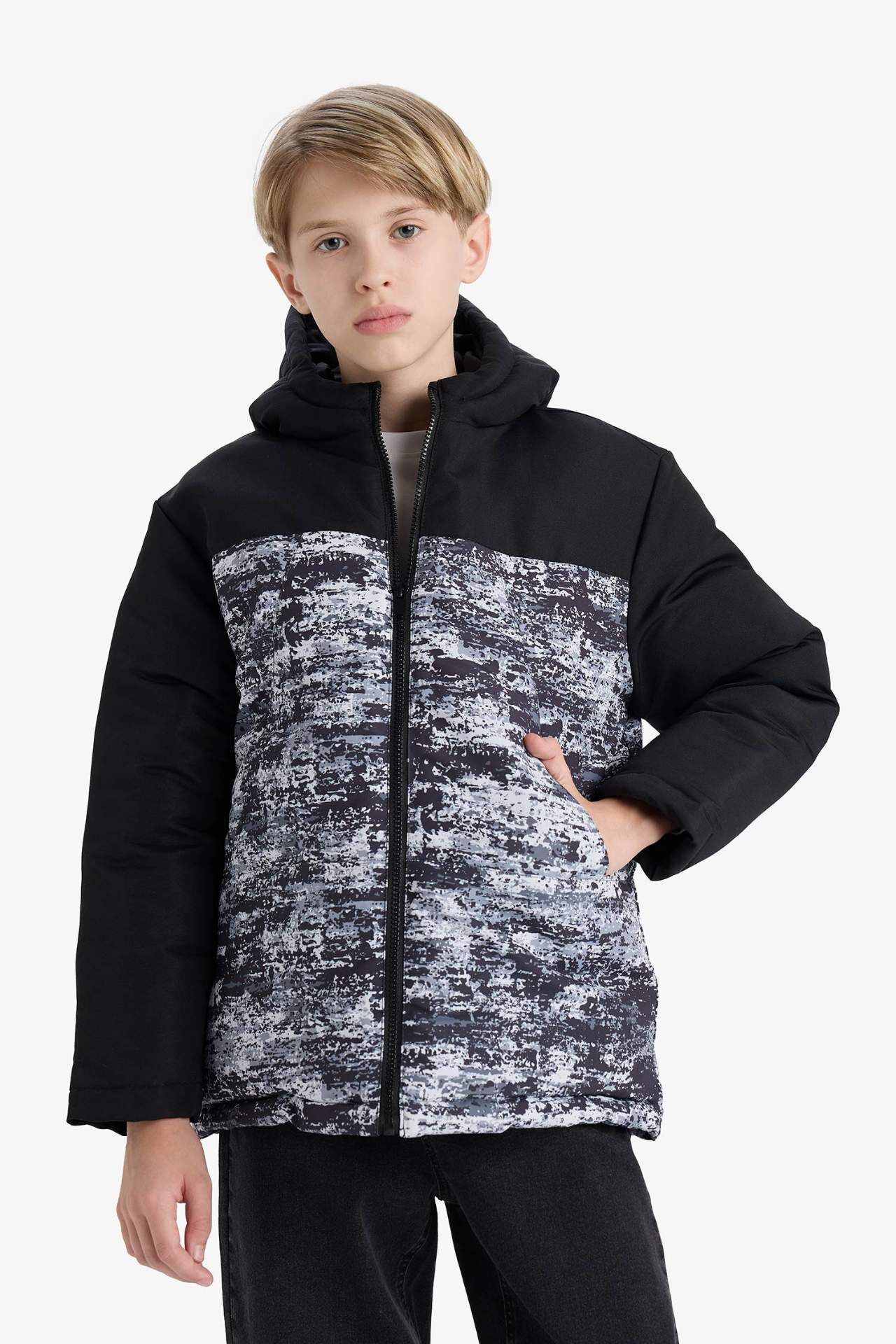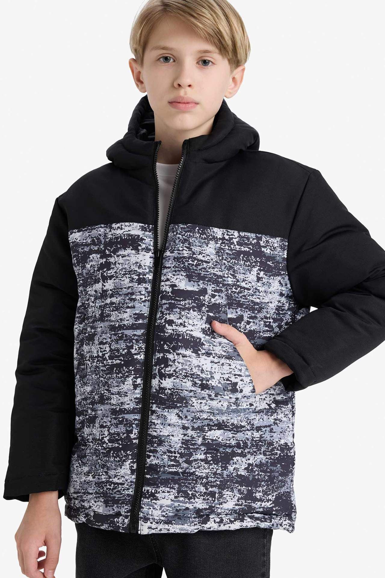 Erkek Çocuk Su İtici Kapüşonlu Fermuarlı Şişme Mont