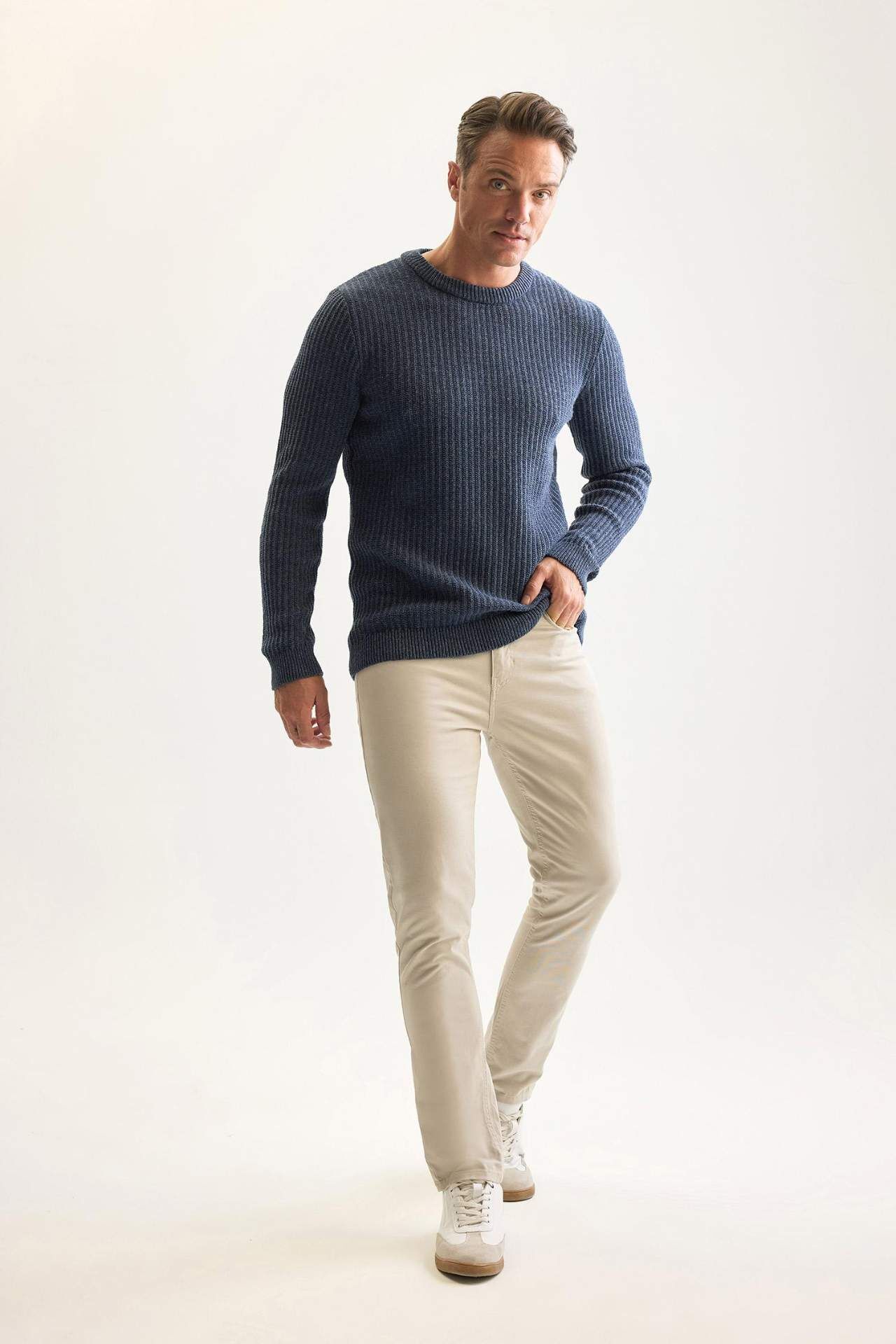 DeFacto Erkek Mavi Standart Fit Bisiklet Yaka Dokulu Triko Kazak