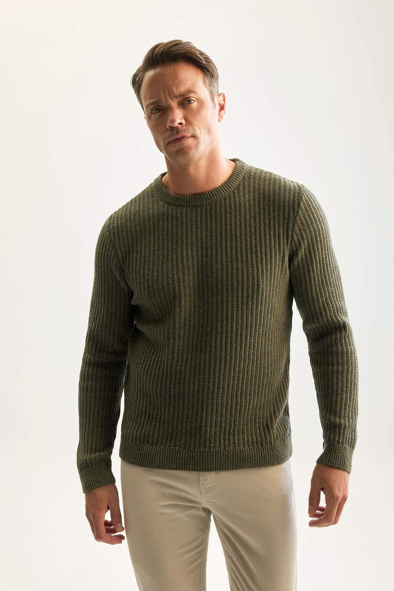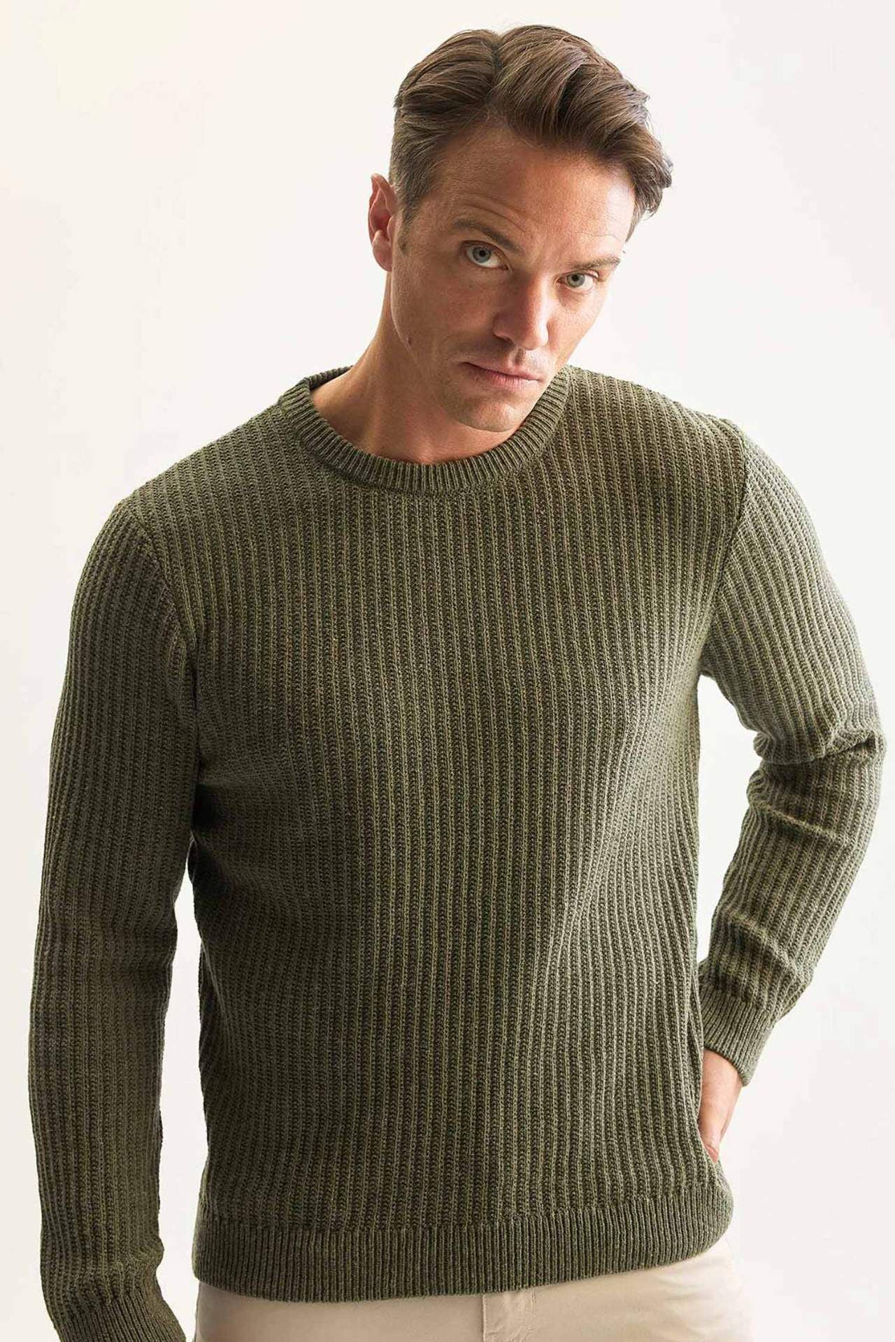 DeFacto Erkek Yeşil Standart Fit Bisiklet Yaka Dokulu Triko Kazak