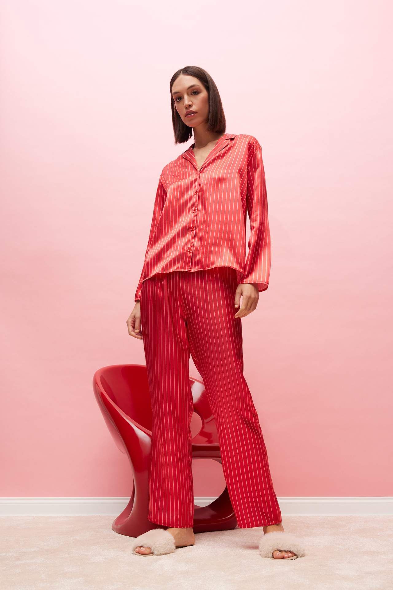 Fall in Love Pijama Takım Saten Uzun Kollu Düğmeli Üst Beli Lastikli Uzun Alt