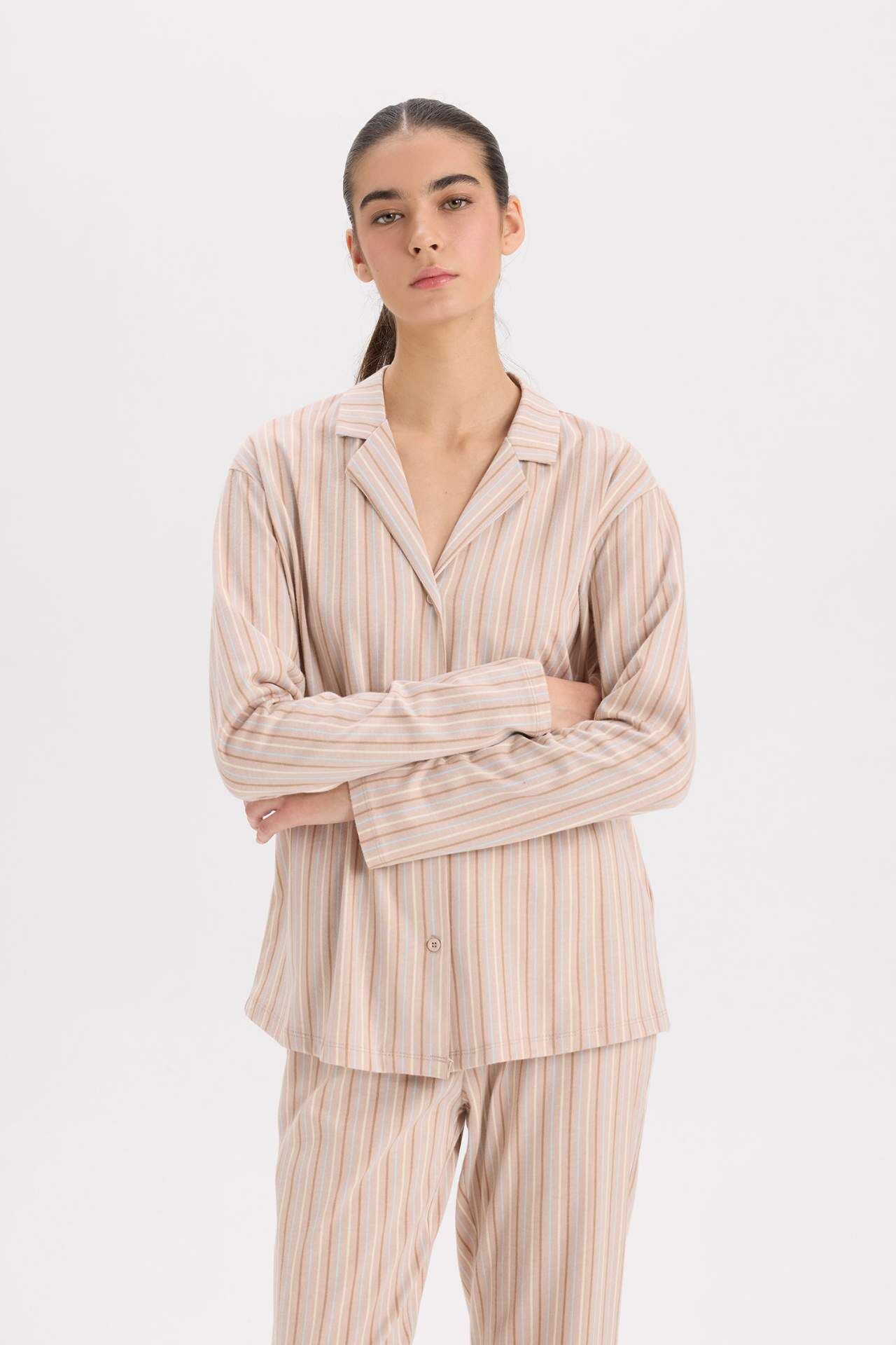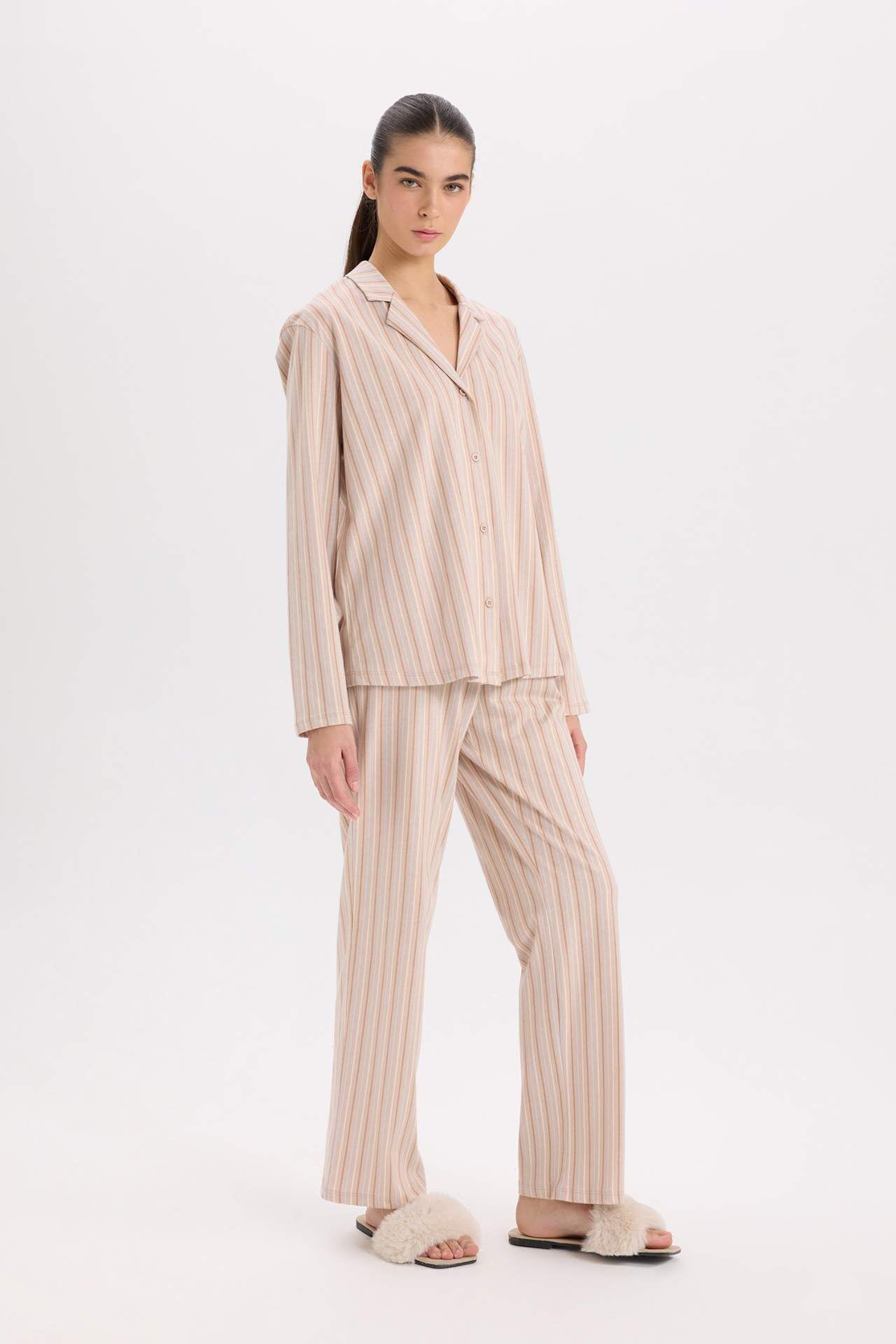 DeFacto Fall in Love Pijama Takım Uzun Kollu Düğmeli Üst Beli Lastikli Uzun Alt