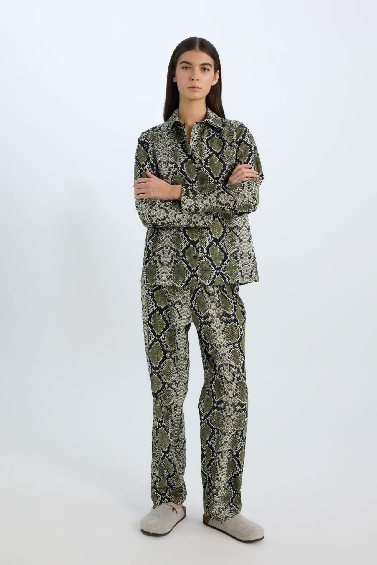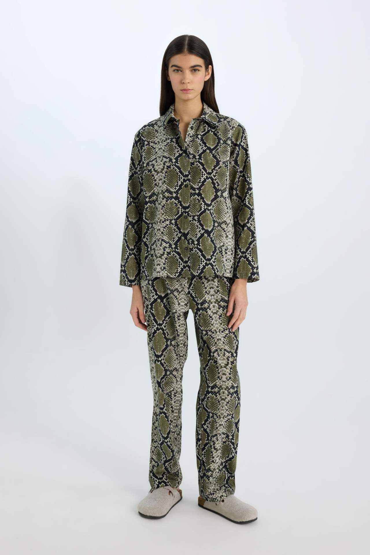 Fall in Love Pijama Takım Yılan Poplin Derisi Desenli Uzun Kollu Üst Esnek Belli Uzun Alt