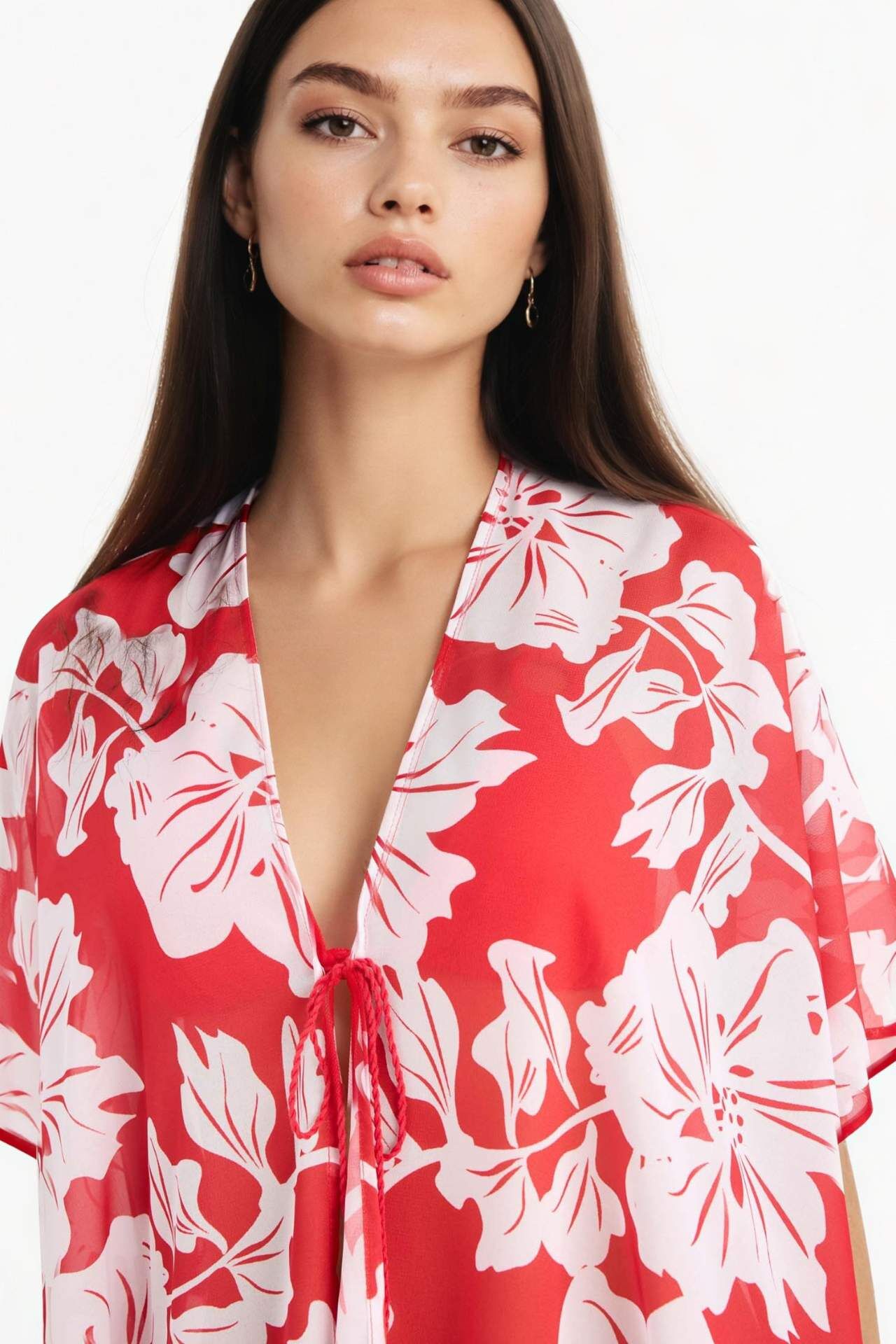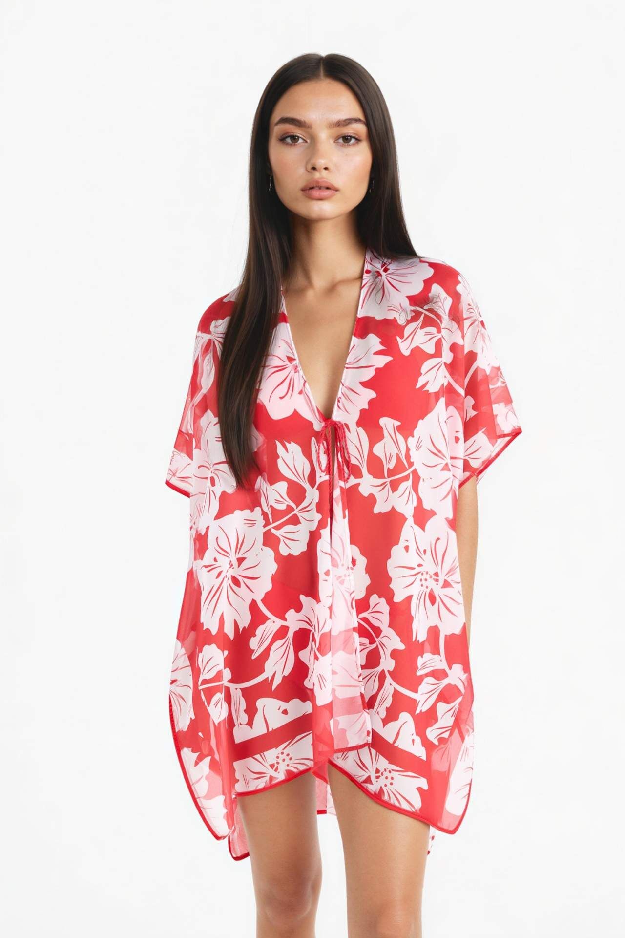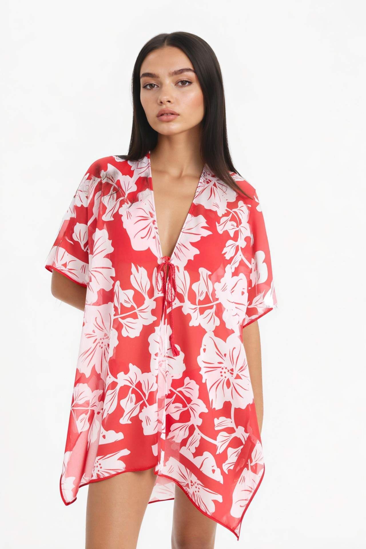 Yetişkinlerin yaz aylarında plajda şıklığına şıklık katacak Fall in Love markasının kırmızı tropikal desenli kimono mayo koleksiyonu. Şifon kumaşın rahatlığı ve regular fit kalıbıyla öne çıkan bu ürün, kadın mayo severler için ideal bir seçim. Temel çeşit içinde yer alan bu kimono, plaj kıyafetlerine farklı bir hava katıyor. Poliester 100%,Poliester 100%,Poliester 100%,Poliester 100%,Poliester 100% Manken Bedeni: Göğüs: 82 Boy: 1,74 Basen: 89 Bel: 59
