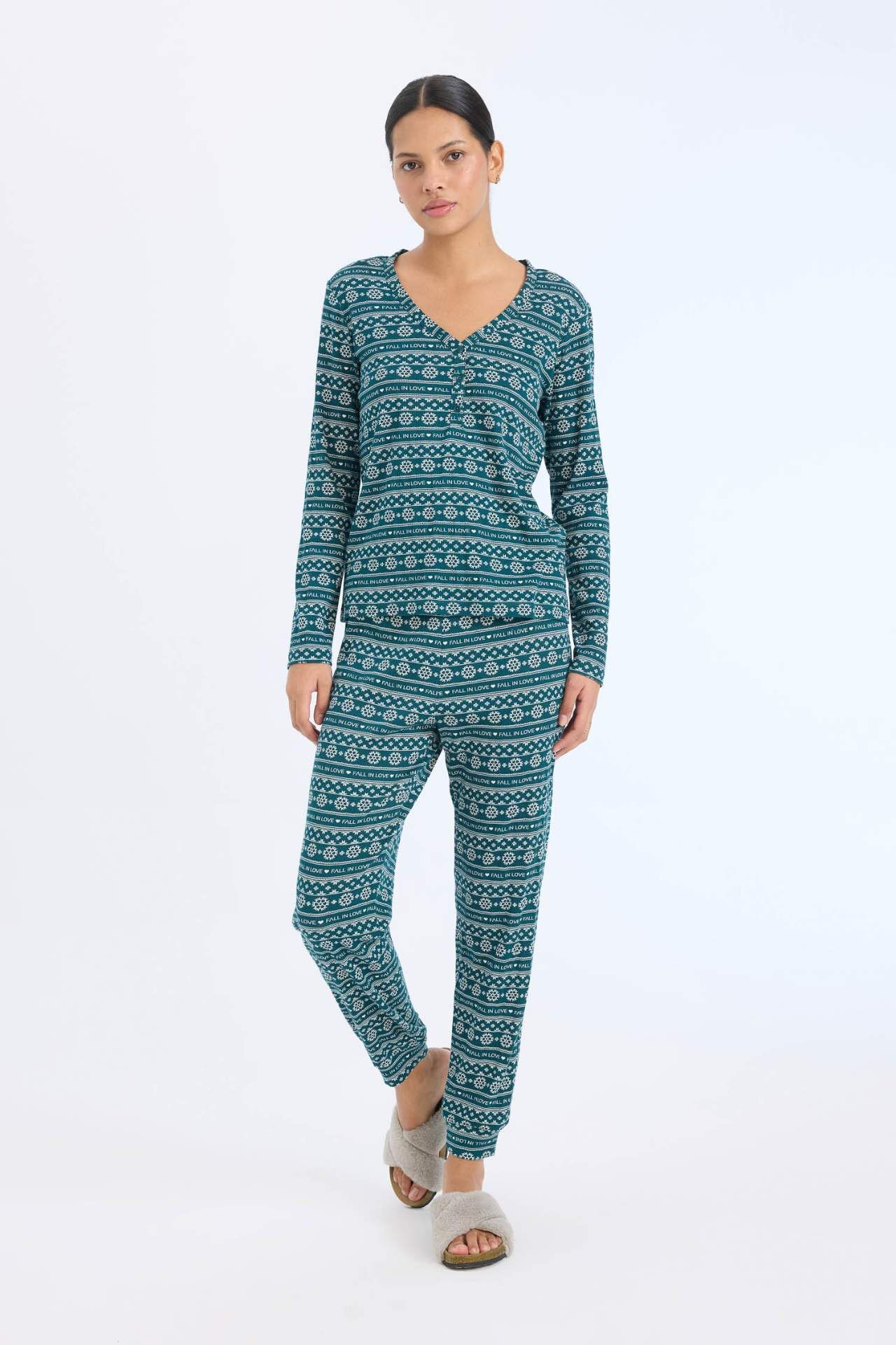 Fall in Love Yılbaşı Temalı Pijama Takımı Waffle Kumaş Uzun Kollu Pijama Üstü Esnek Belli Uzun Pijama Altı