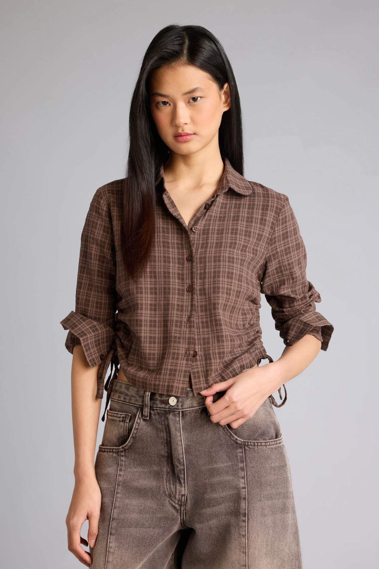Fıtted Bebe Yaka Kareli Keten Karışımlı Uzun Kollu Gömlek