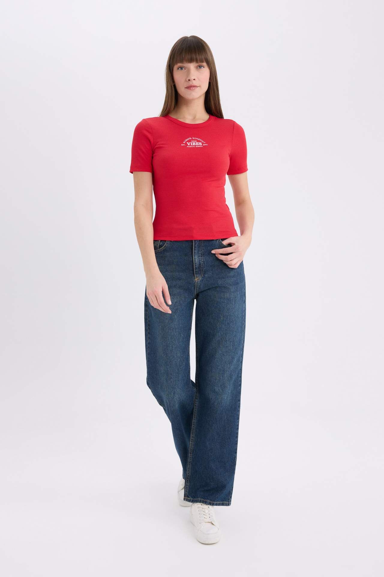 DeFacto Fitted Bisiklet Yaka Baskılı Casual Fitilli Kaşkorse Kısa Kollu Tişört