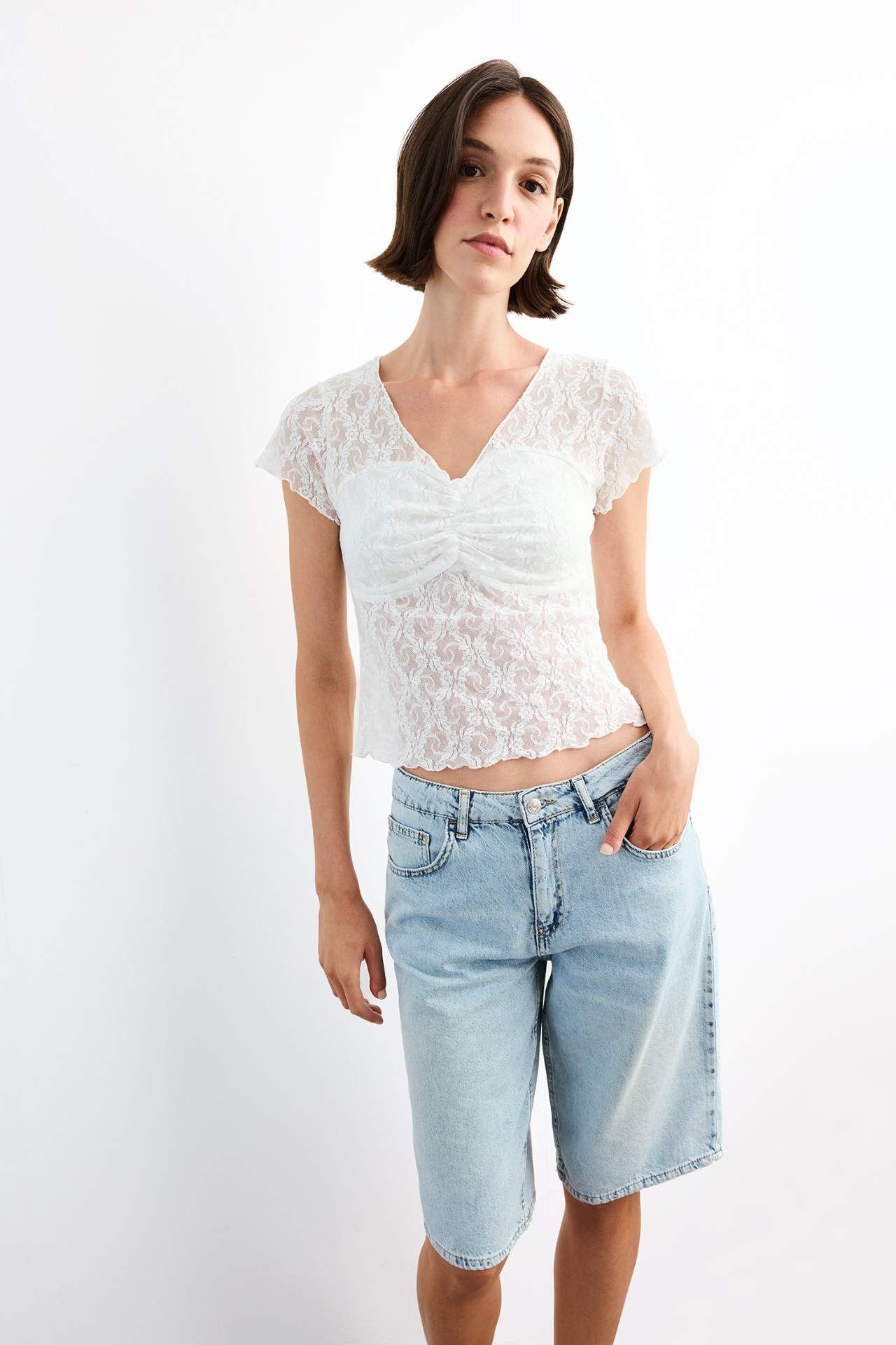 Fitted V Yaka Dantel Kısa Kollu Tişört, vücuda oturan kesimi ve zarif dantel detaylarıyla feminen bir şıklık sunar. Yumuşak dokusu sayesinde gün boyu konfor sağlar. Hem günlük hem şık kombinlerde rahatlıkla kullanılabilir. Poliamid 100%,Poliamid 100%,Poliamid 100%,Poliamid 100%,Poliamid 100%,Poliamid 100% Manken Bedeni: Göğüs: 83 Boy: 1,81 Basen: 90 Bel: 58
