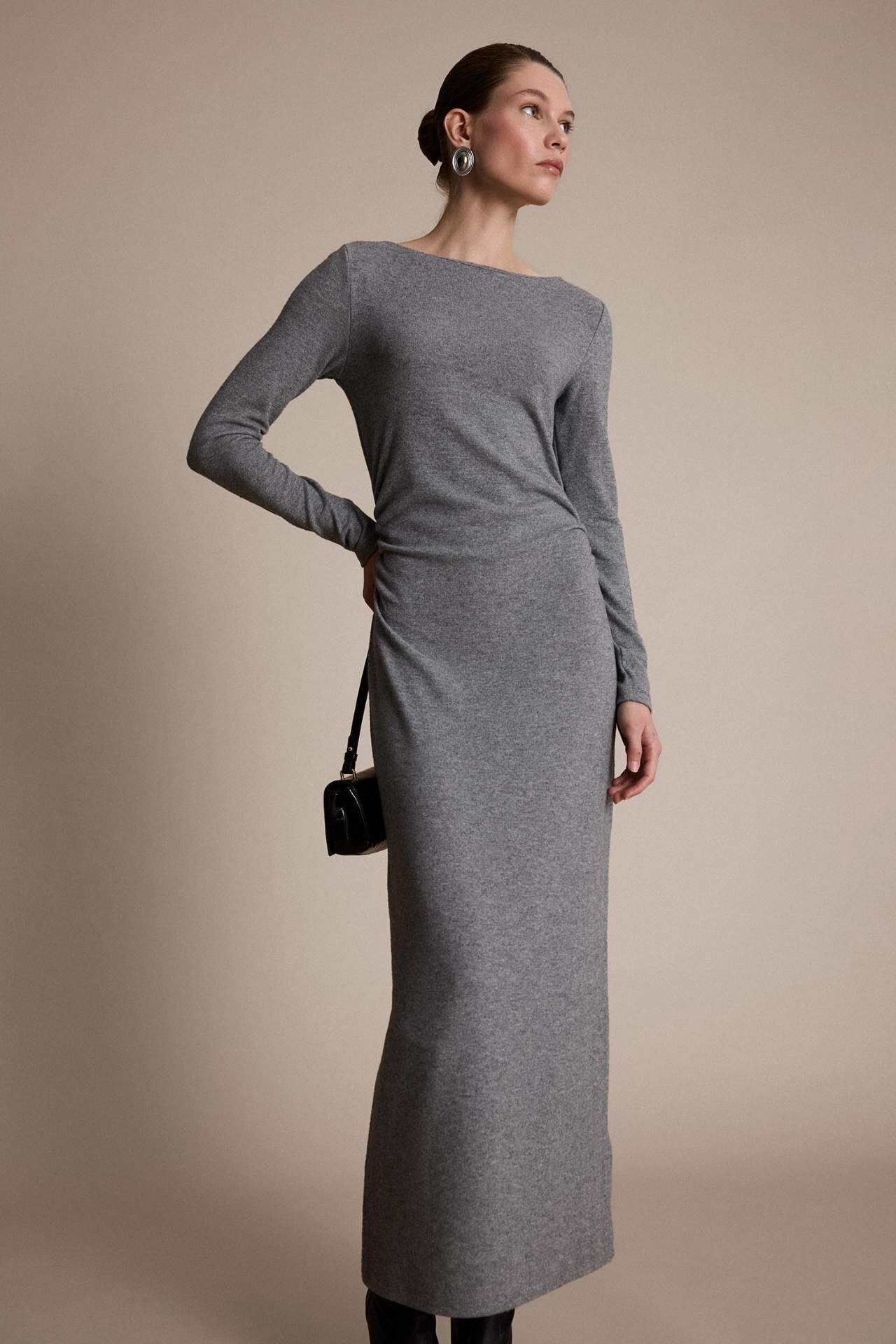 Fitted Bisiklet Yaka Penye Uzun Kollu Midi Elbise