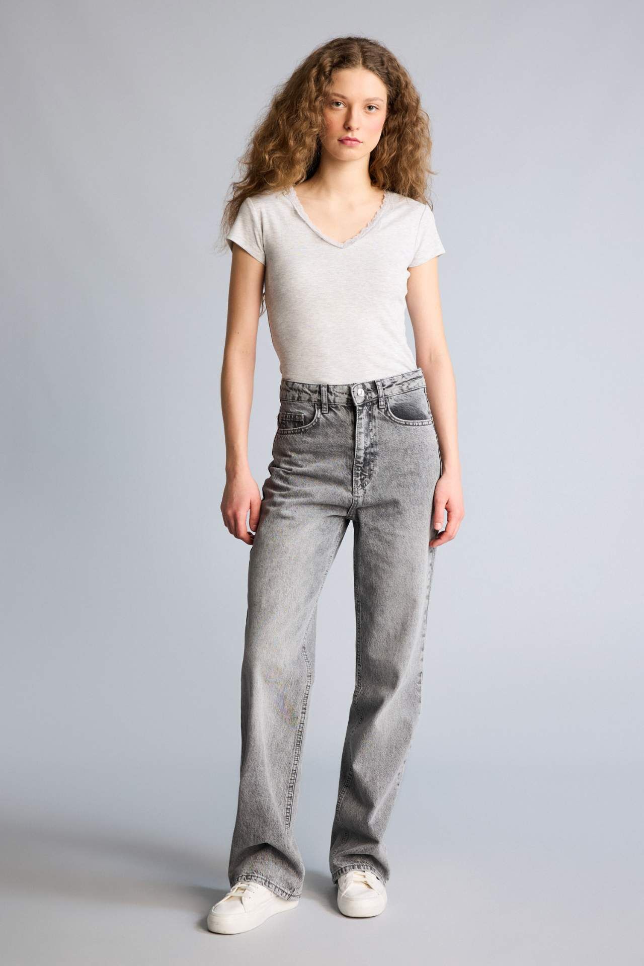 Fıtted Dantel Yaka Ribana Kısa Kollu Tişört