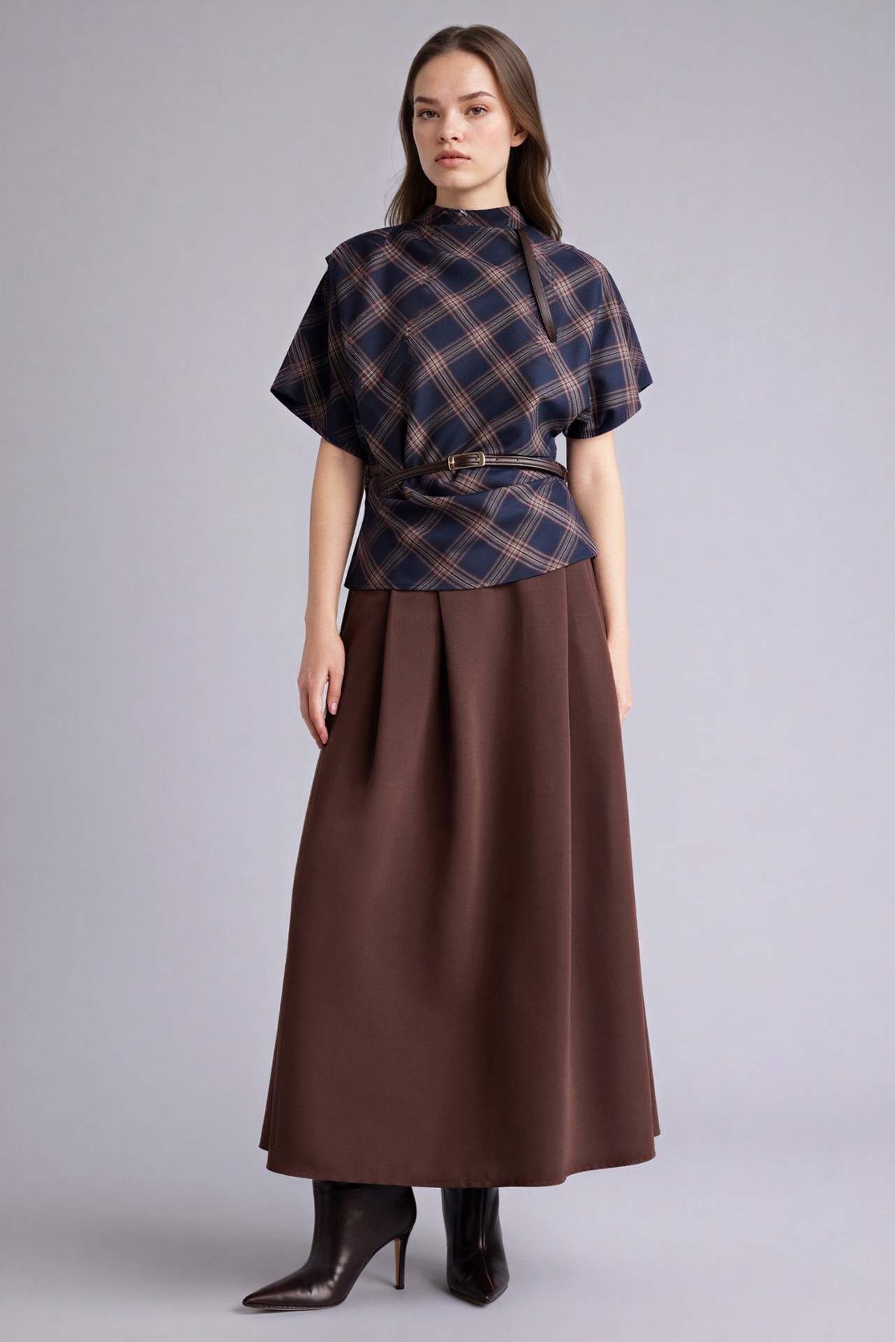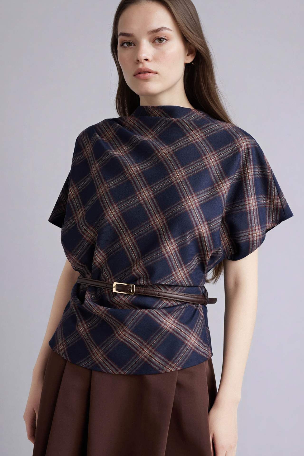 Fıtted Dik Yaka Kareli Flanel Kısa Kollu Bluz