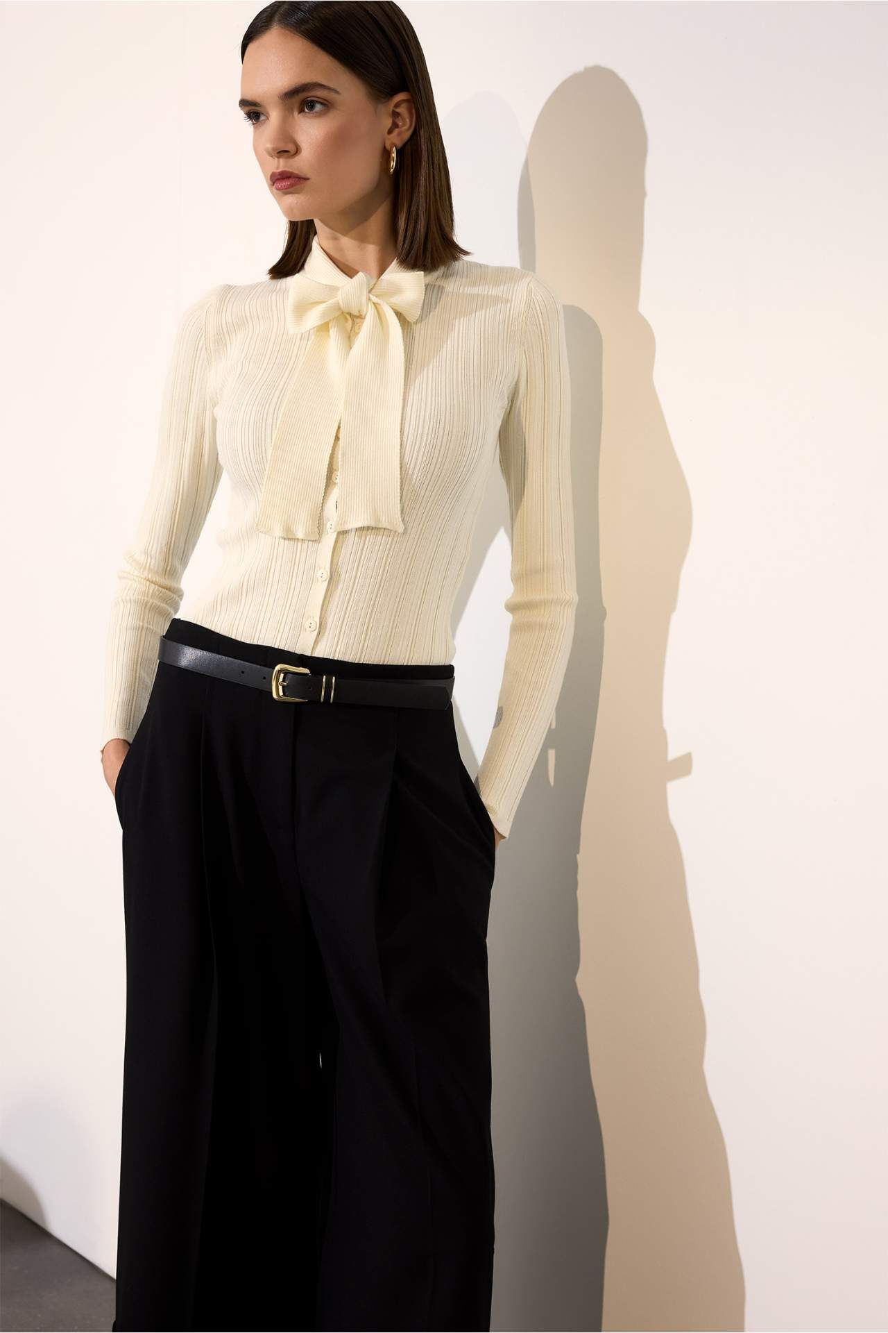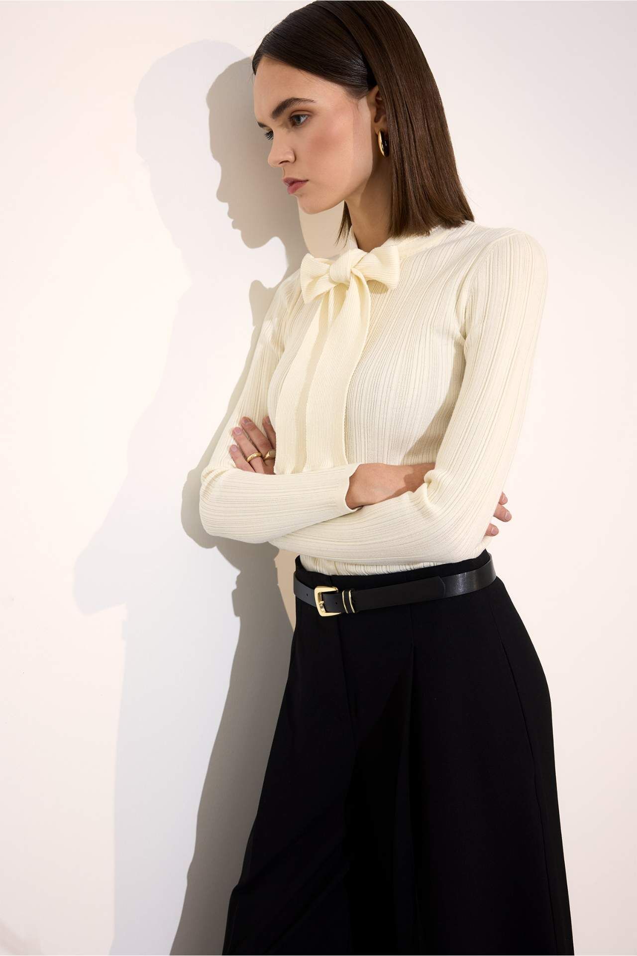 Fitted fiyonk yaka triko kazak, vücuda oturan kesimiyle zarif bir siluet sunarken fiyonk detaylı yakasıyla feminen bir şıklık kazandırır. Yumuşak triko dokusu sayesinde gün boyu konfor sağlar ve hem günlük hem de şık kombinlere kolayca uyum sağlar. Viskoz 33%,Poliester 67% Manken Bedeni: Göğüs: 85 Boy: 1,77 Basen: 89 Bel: 62