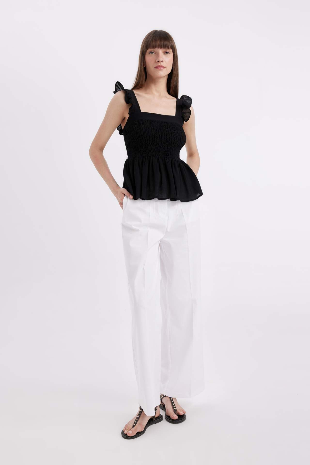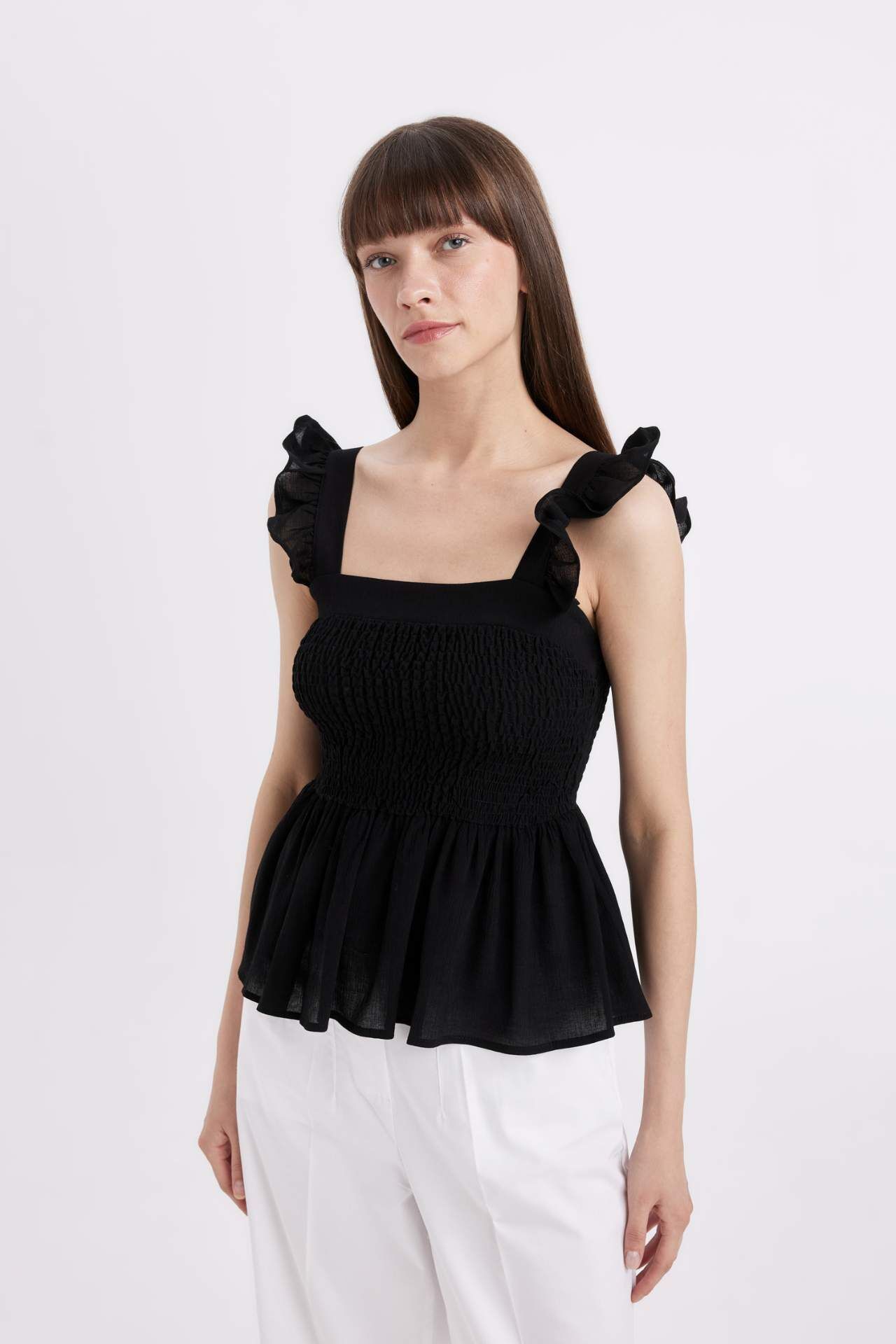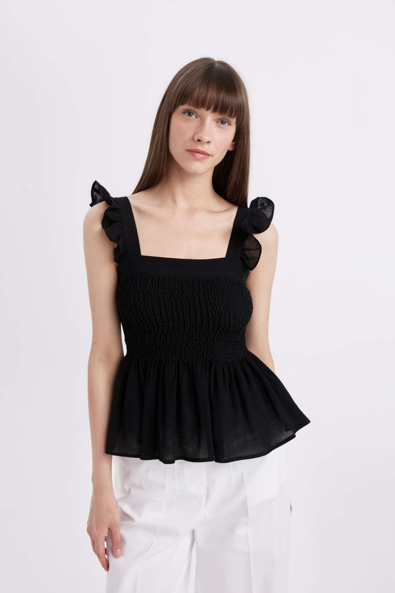 DeFactoFit Fitted Kare Yaka Siyah Krinkıl Kumaş Kolsuz Bluz