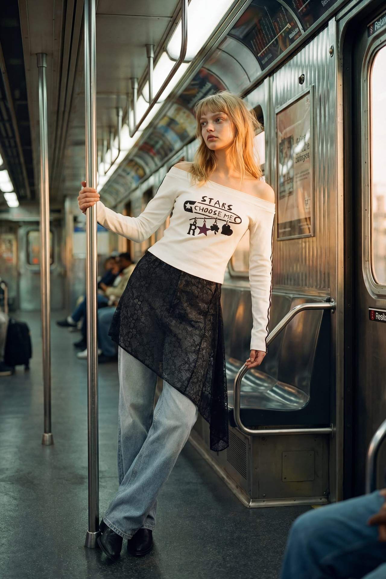 Fitted Kayık Yaka Baskılı Ribana Uzun Kollu Tişört