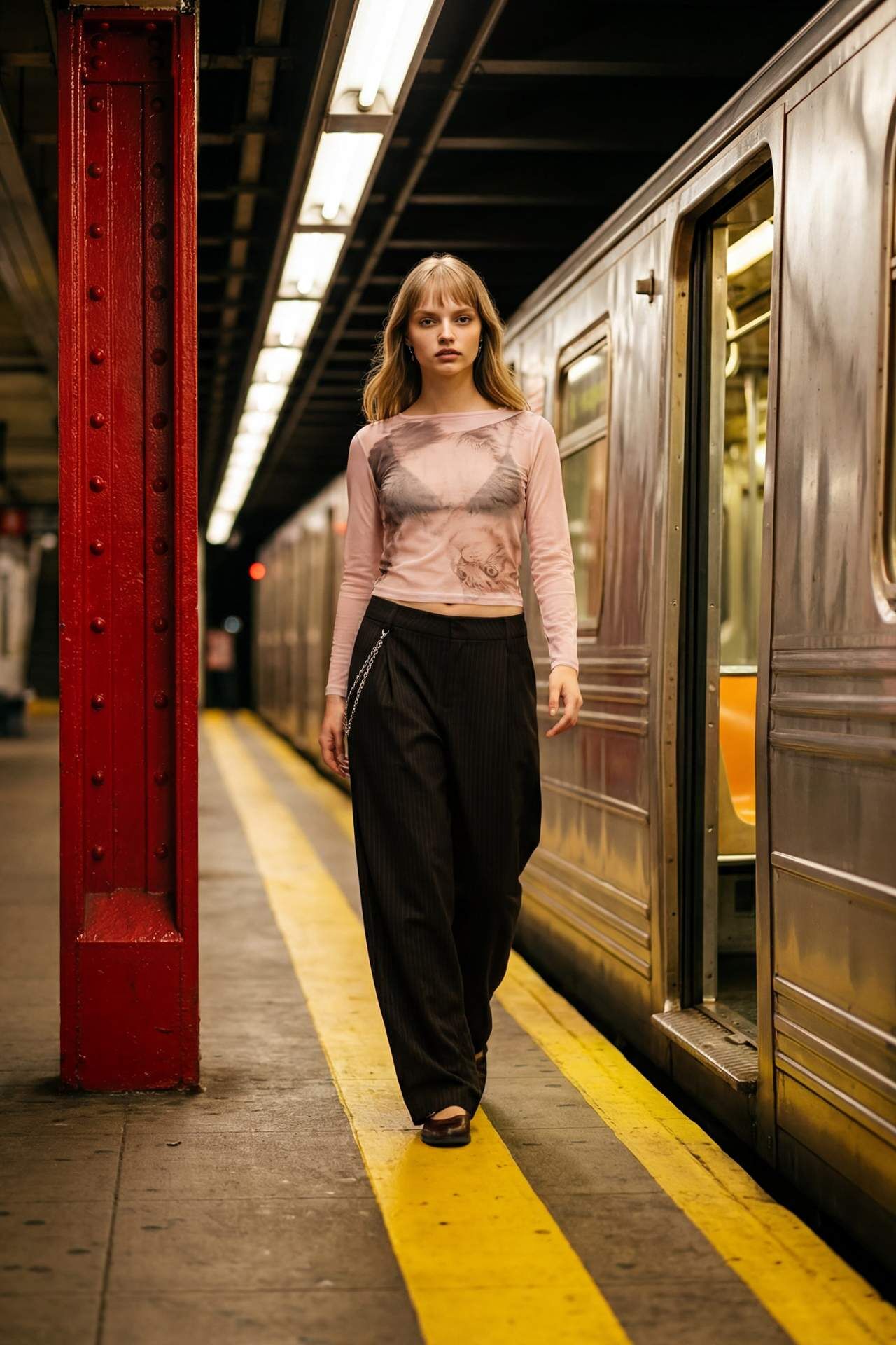 Fitted Kayık Yaka Baskılı Tül Uzun Kollu Tişört