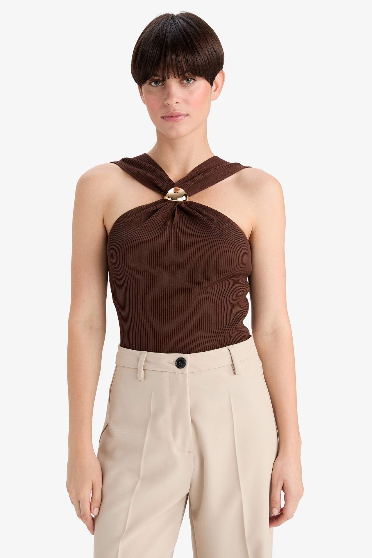 Fitted kesimi ve ribana kumaşıyla vücuda oturan bu kolsuz bluz, şık toka detayıyla sade ve zarif bir görünüm sunar. Hem günlük hem özel kombinlerde rahatlıkla tercih edilir. Poliester 100%,Poliester 100%,Poliester 100%,Poliester 100%,Poliester 100%,Poliester 100%,Poliester 100% Manken Bedeni: Göğüs: 85 Boy: 1,7 Basen: 88 Bel: 60
