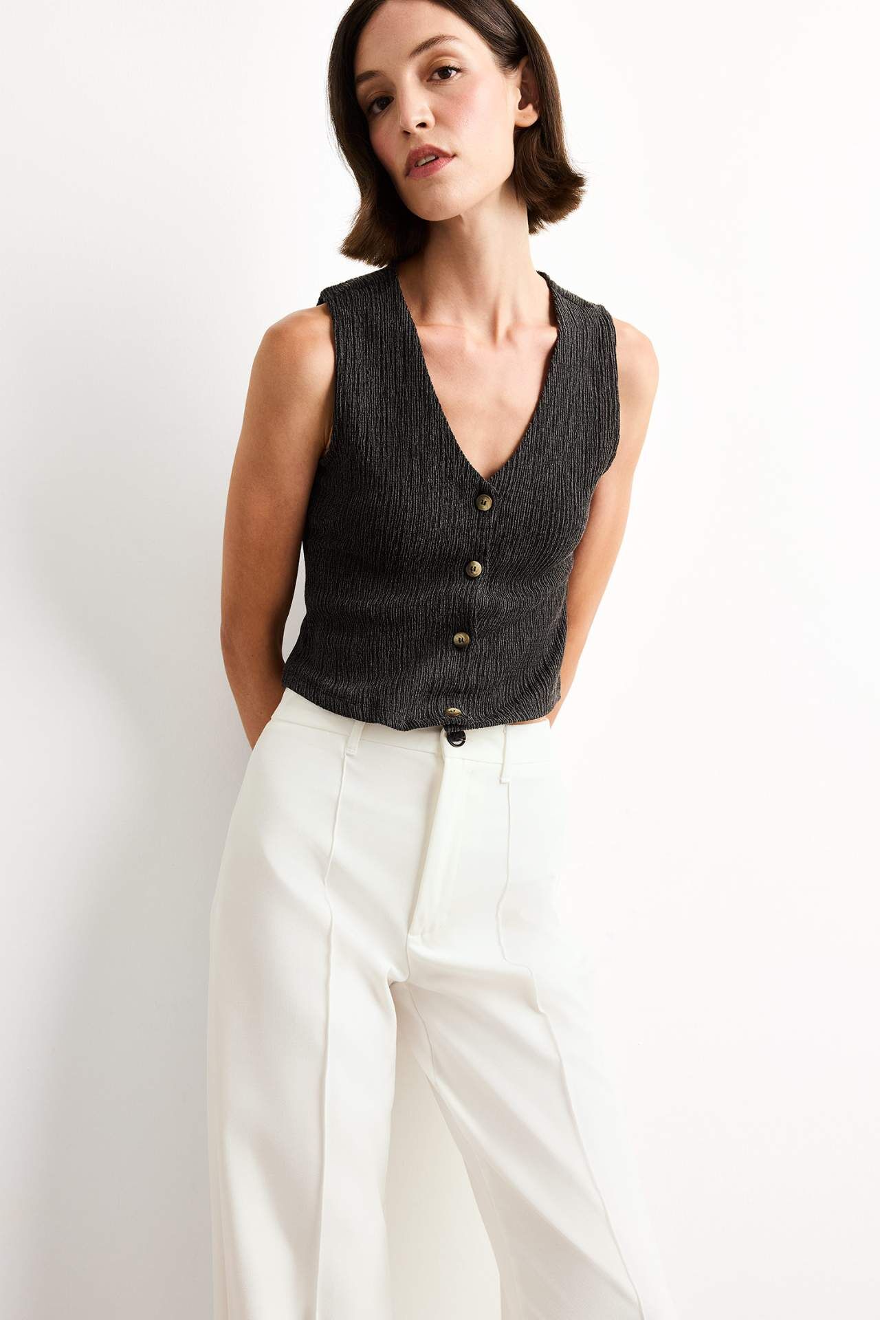 Fitted V Yaka Bürümcük Düğmeli Kolsuz Bluz