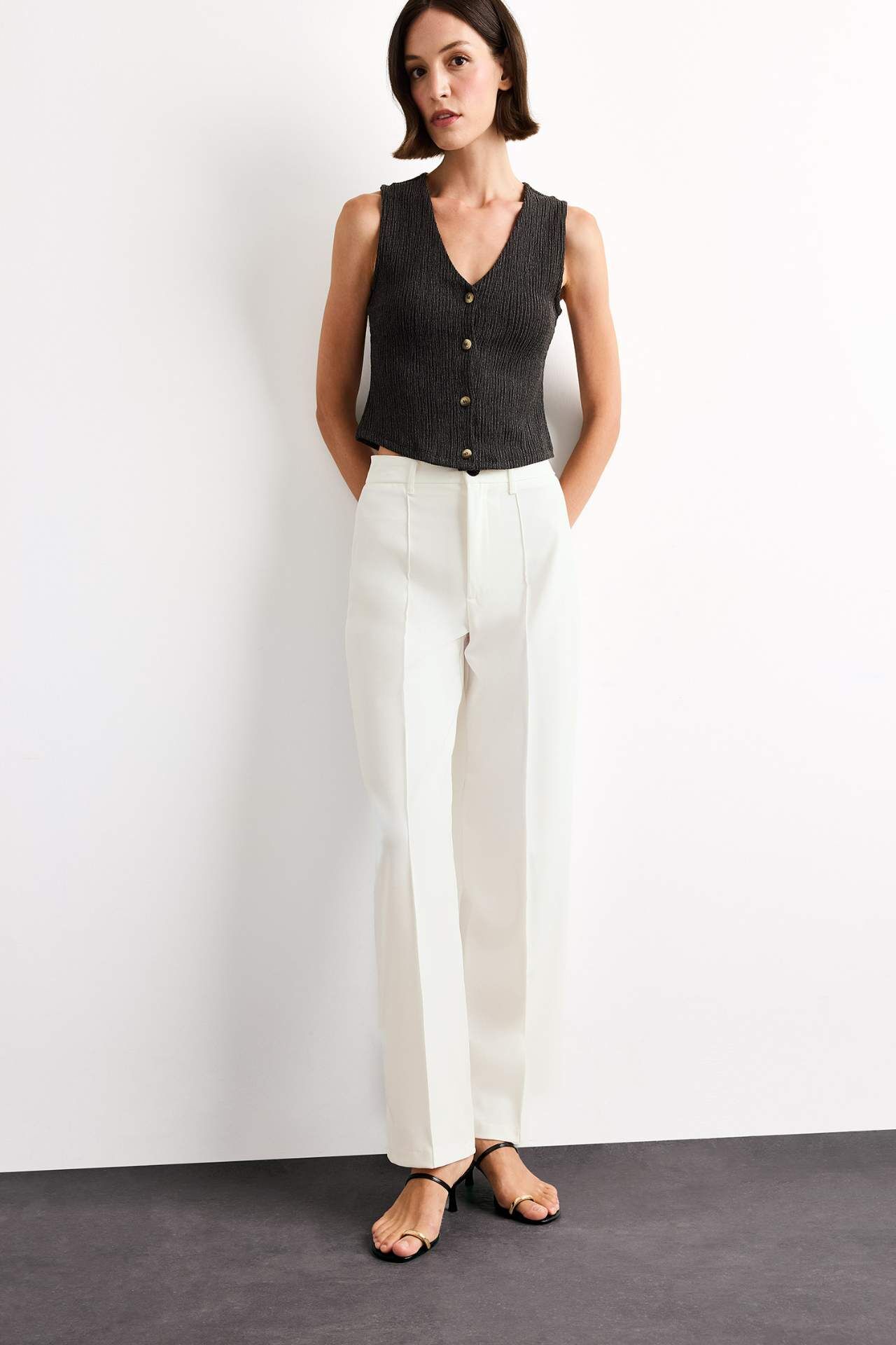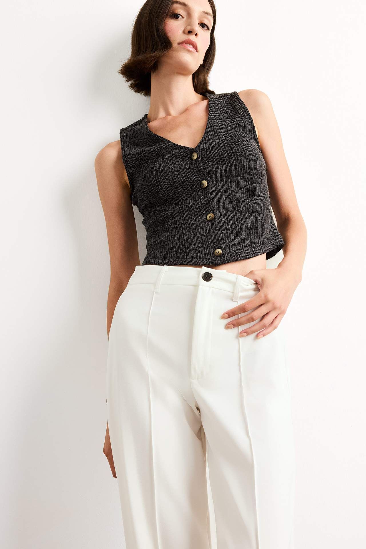 Fitted V Yaka Bürümcük Düğmeli Kolsuz Bluz, vücudu saran formu ve dokulu yapısıyla modern bir görünüm sunar. V yaka detayı ve ön kısmındaki düğmeler, şıklığı minimal dokunuşlarla tamamlar. Viskoz 22%,Poliester 78%,Viskoz 22%,Poliester 78%,Viskoz 22%,Poliester 78%,Viskoz 22%,Poliester 78%,Viskoz 22%,Poliester 78%,Viskoz 22%,Poliester 78%,Viskoz 22%,Poliester 78% Manken Bedeni: Göğüs: 83 Boy: 1,81 Basen: 90 Bel: 58