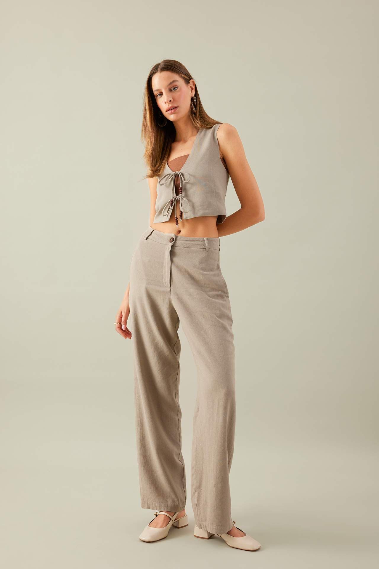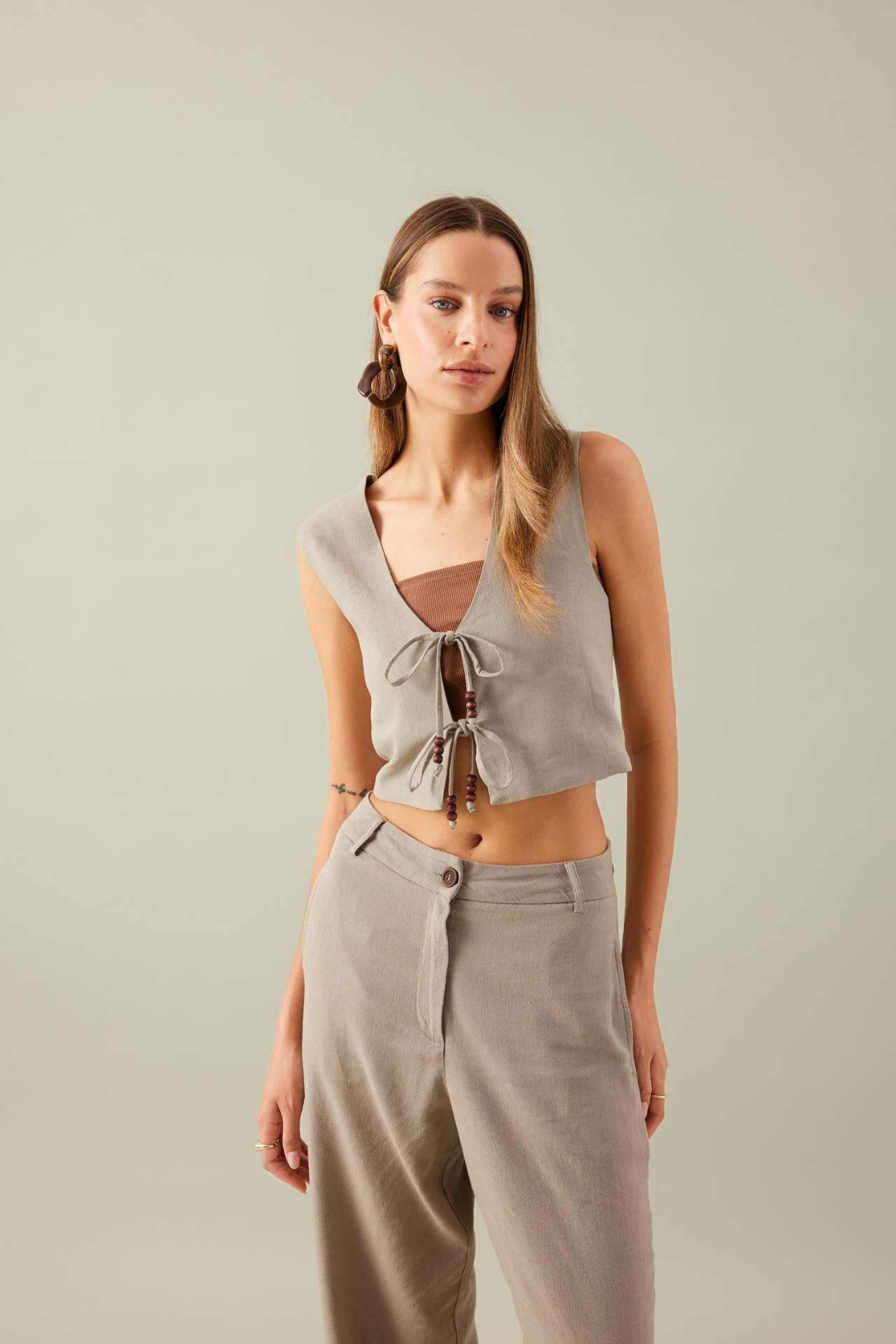 Fitted V Yaka Keten Karışımlı Bağcıklı Yelek