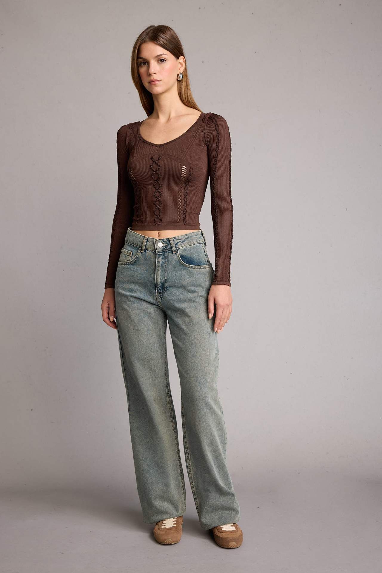 Fitted kesimi ve V yaka tasarımıyla şık bir siluet sunan uzun kollu tişört, vücuda tam oturarak modern ve zarif bir görünüm sağlar. Esnek ve yumuşak kumaşıyla gün boyu konforludur. Poliamid 25%,Elastan 5%,Poliester 70%