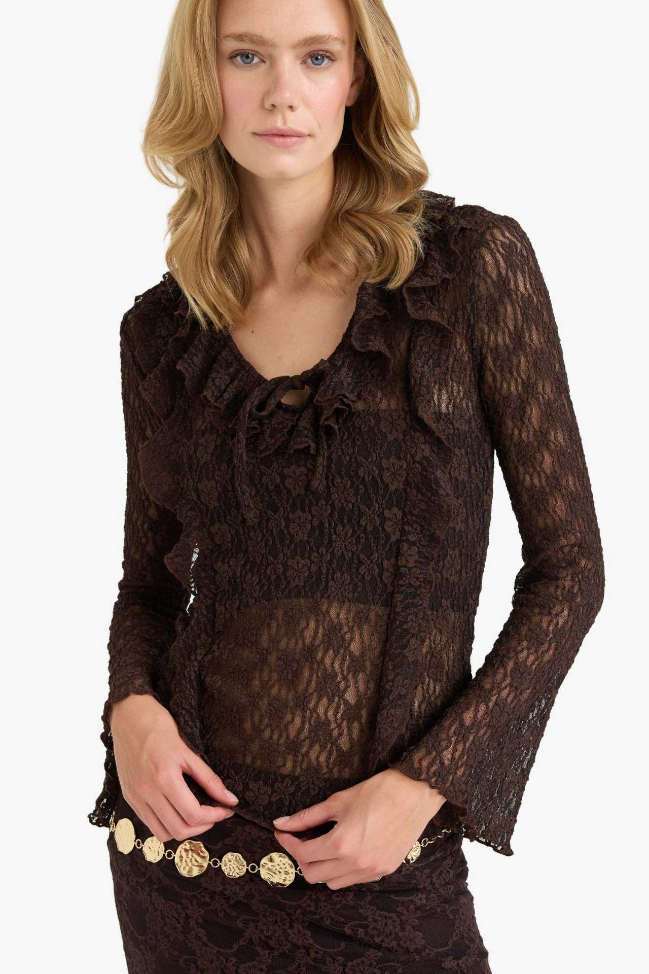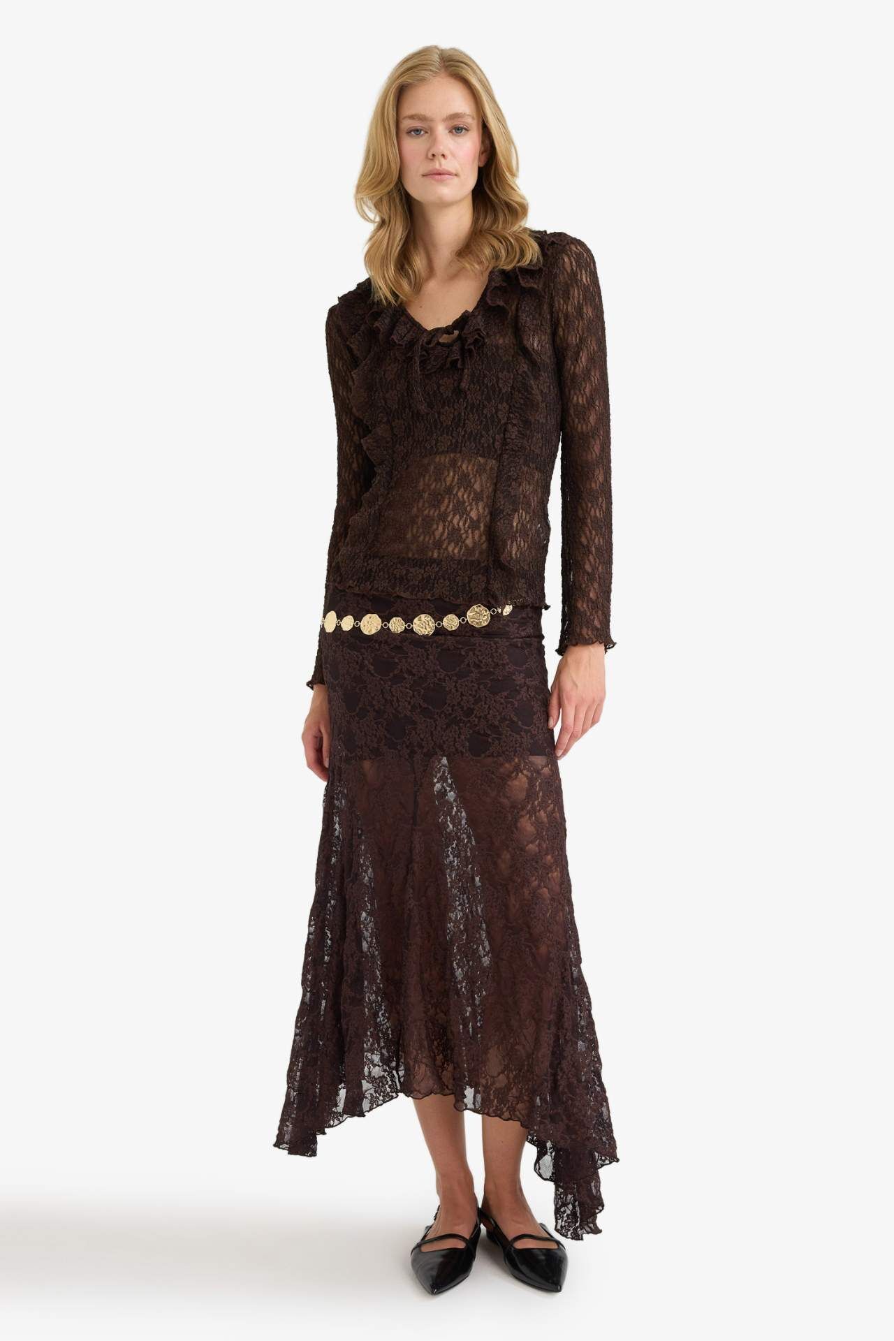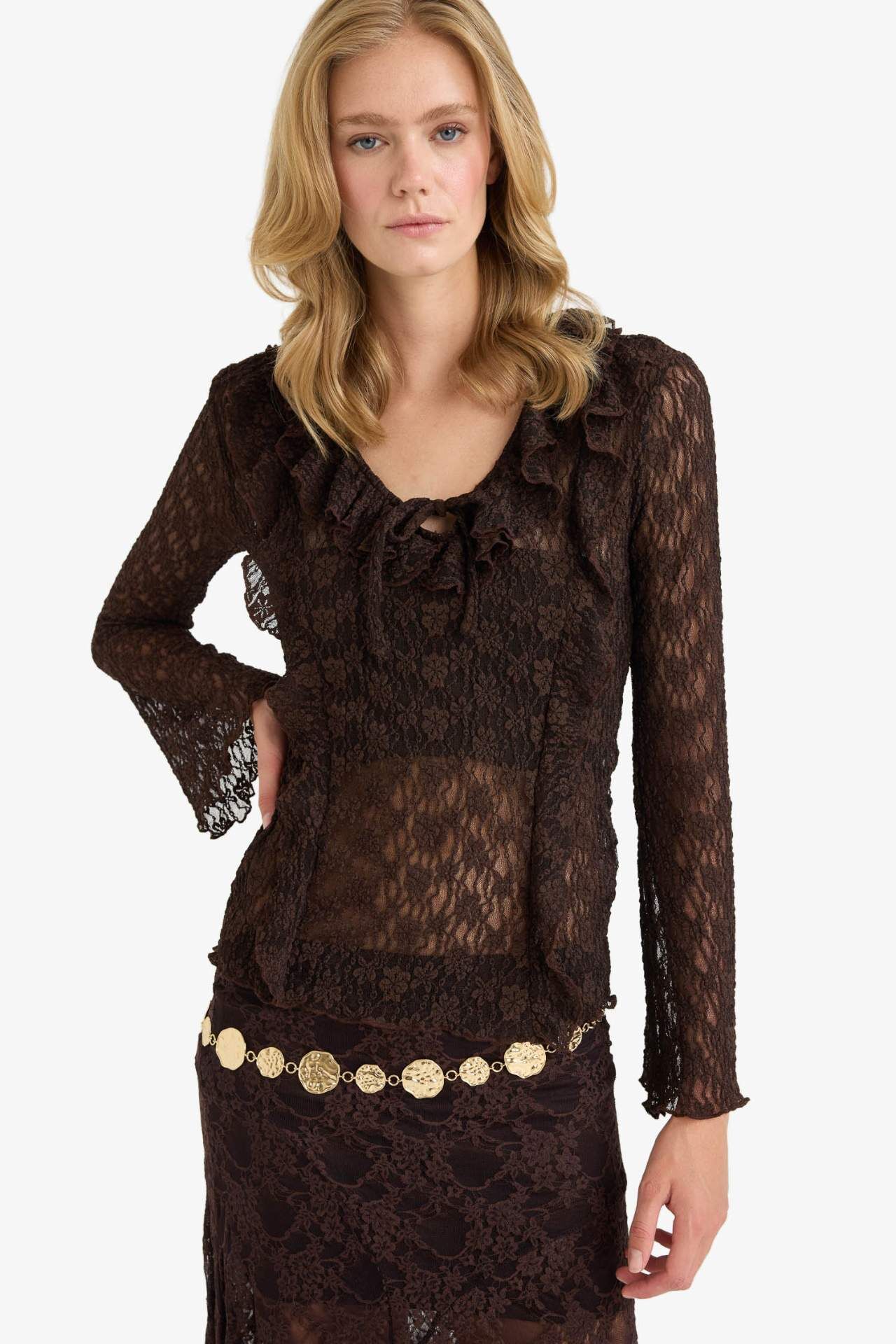 Fitted V Yaka Volanlı Dantel Uzun Kollu Bluz