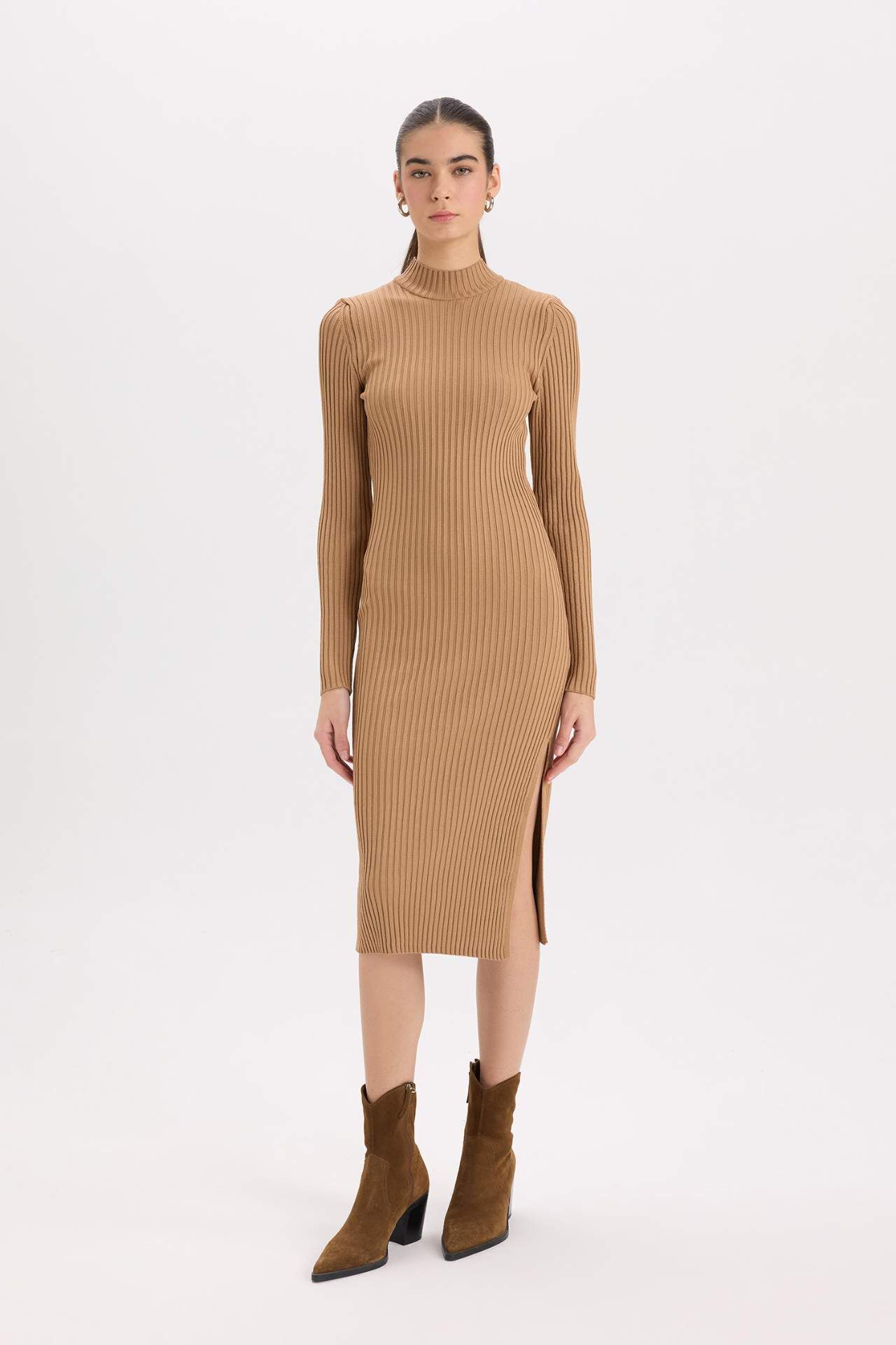 Fitted Vücudu Saran Yarım Balıkçı Yaka Basic Düz Uzun Kollu Triko Elbise
