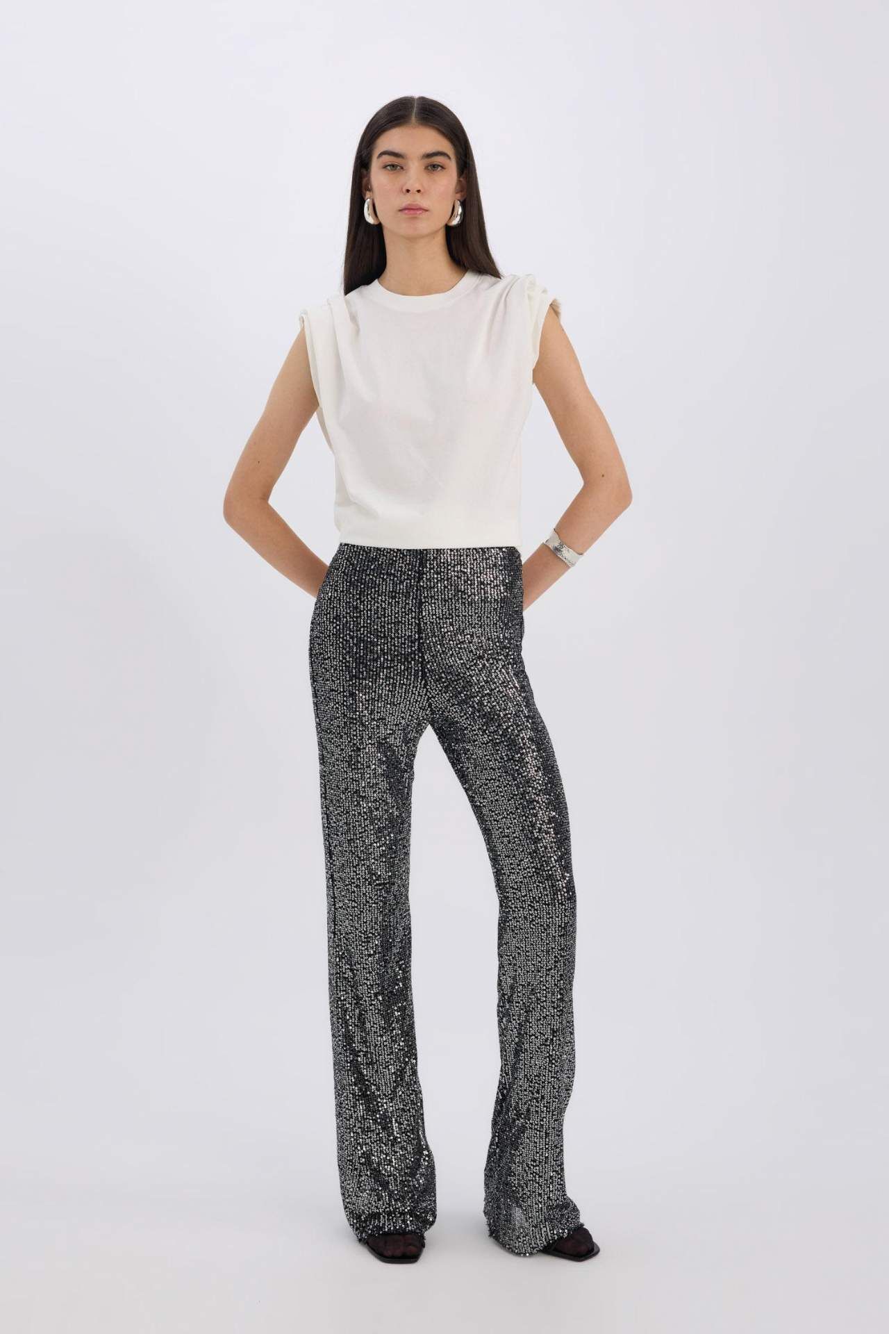 DeFacto Flare Fit Yüksek Bel Standart Boy Payetli Siyah Şık Pantolon