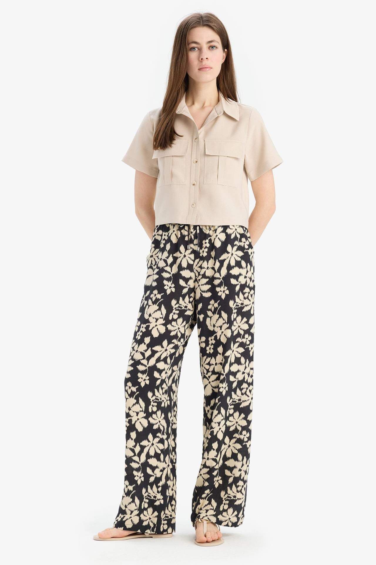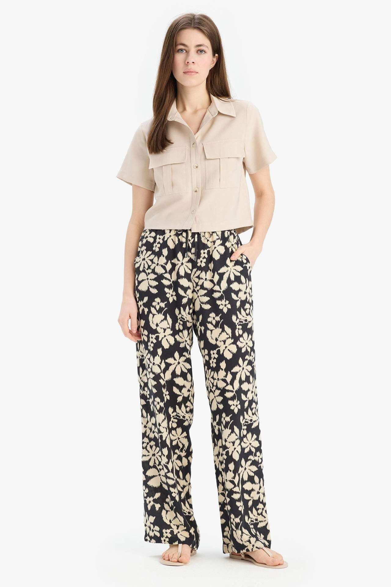 DeFacto Florida Desenli Viskon Kumaş Pantolon Cepli Yüksek Bel Geniş Paça Uzun Boy