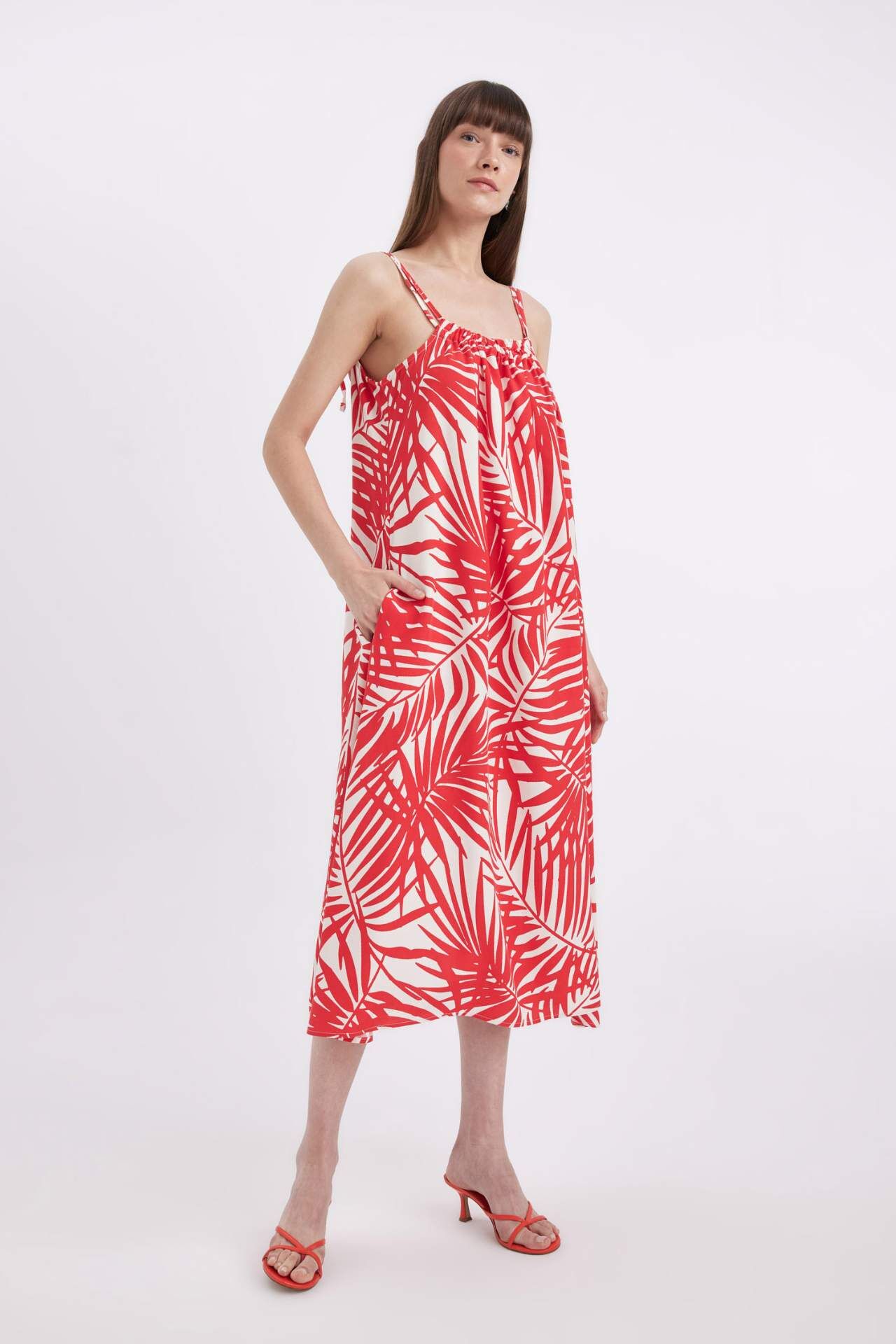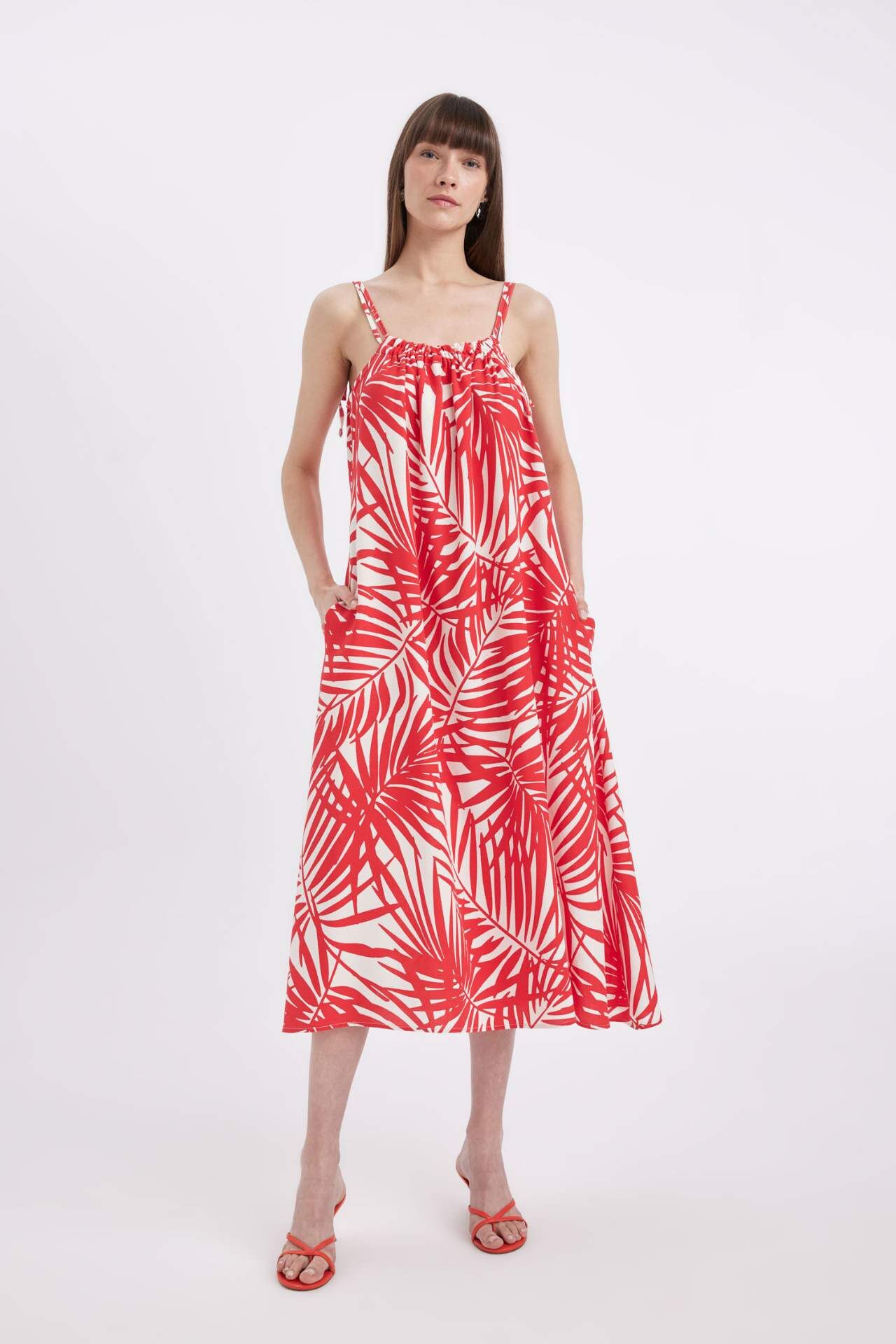 Gömlek Yaka Baskılı Keten Karışımlı Kısa Kollu Midi Elbise