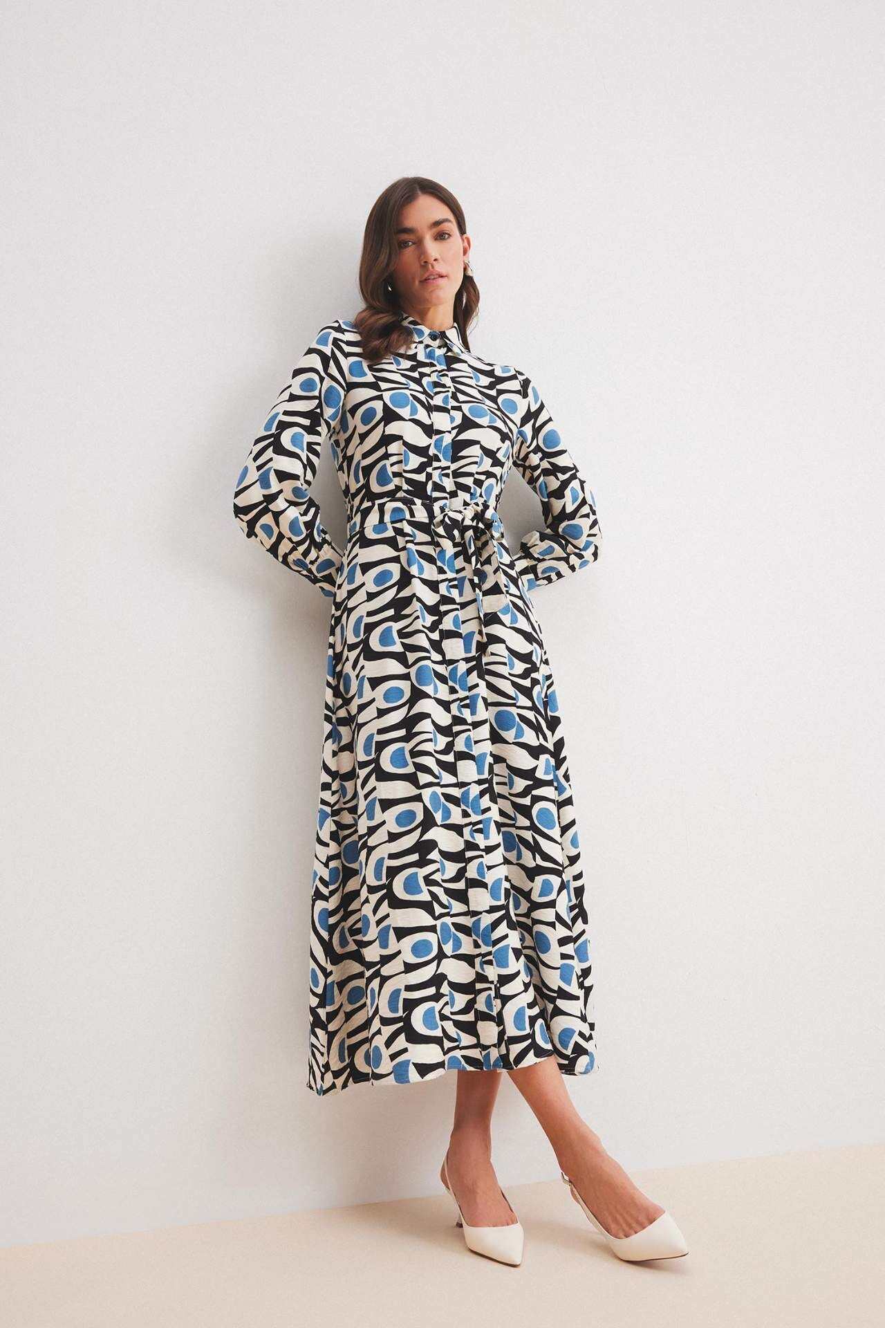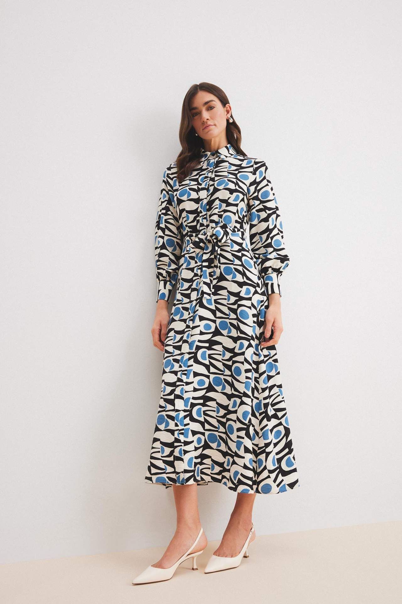 Gömlek Yaka Desenli Kuşaklı Uzun Kollu Maxi Elbise