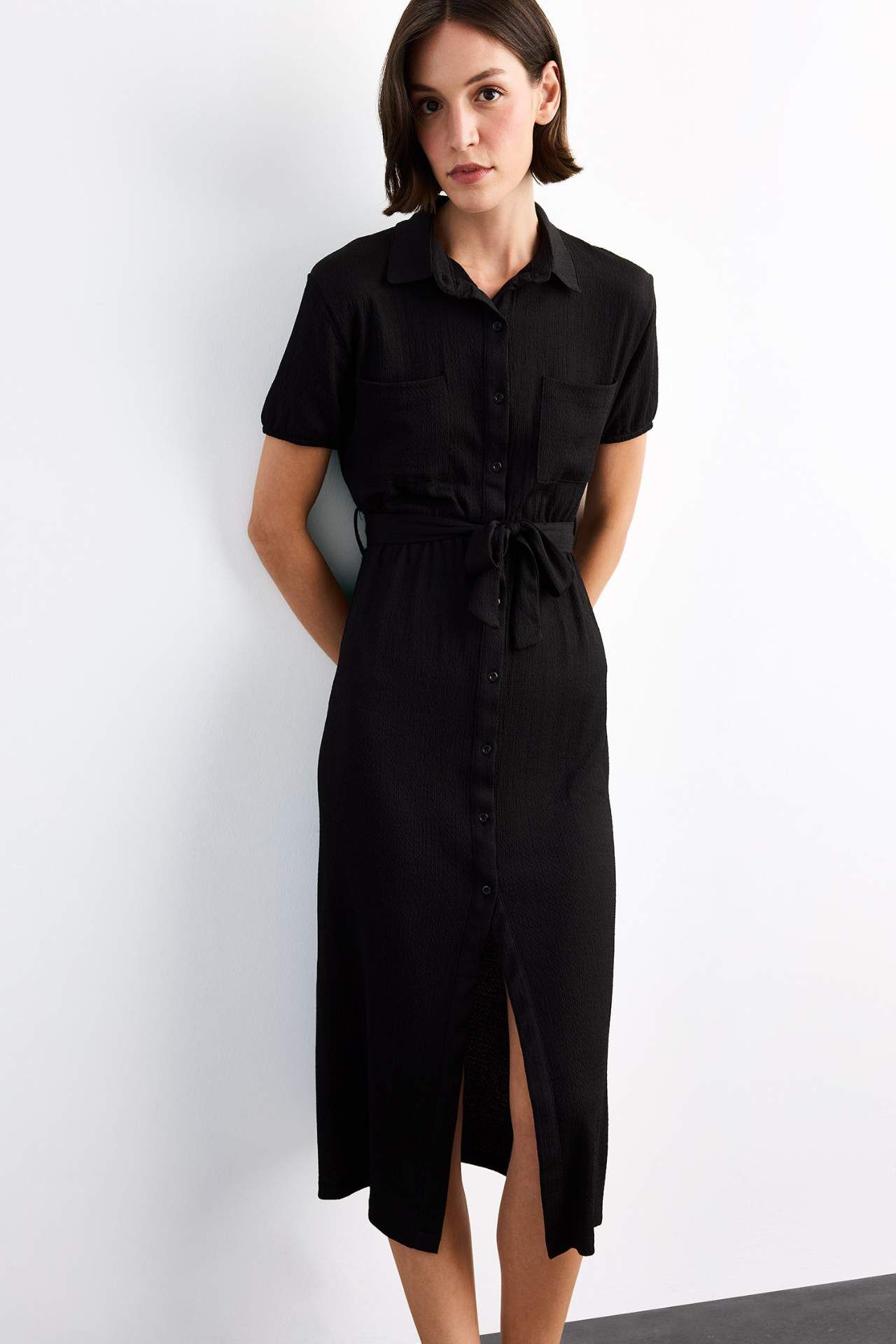Gömlek Yaka Kemerli Kısa Kollu Midi Elbise