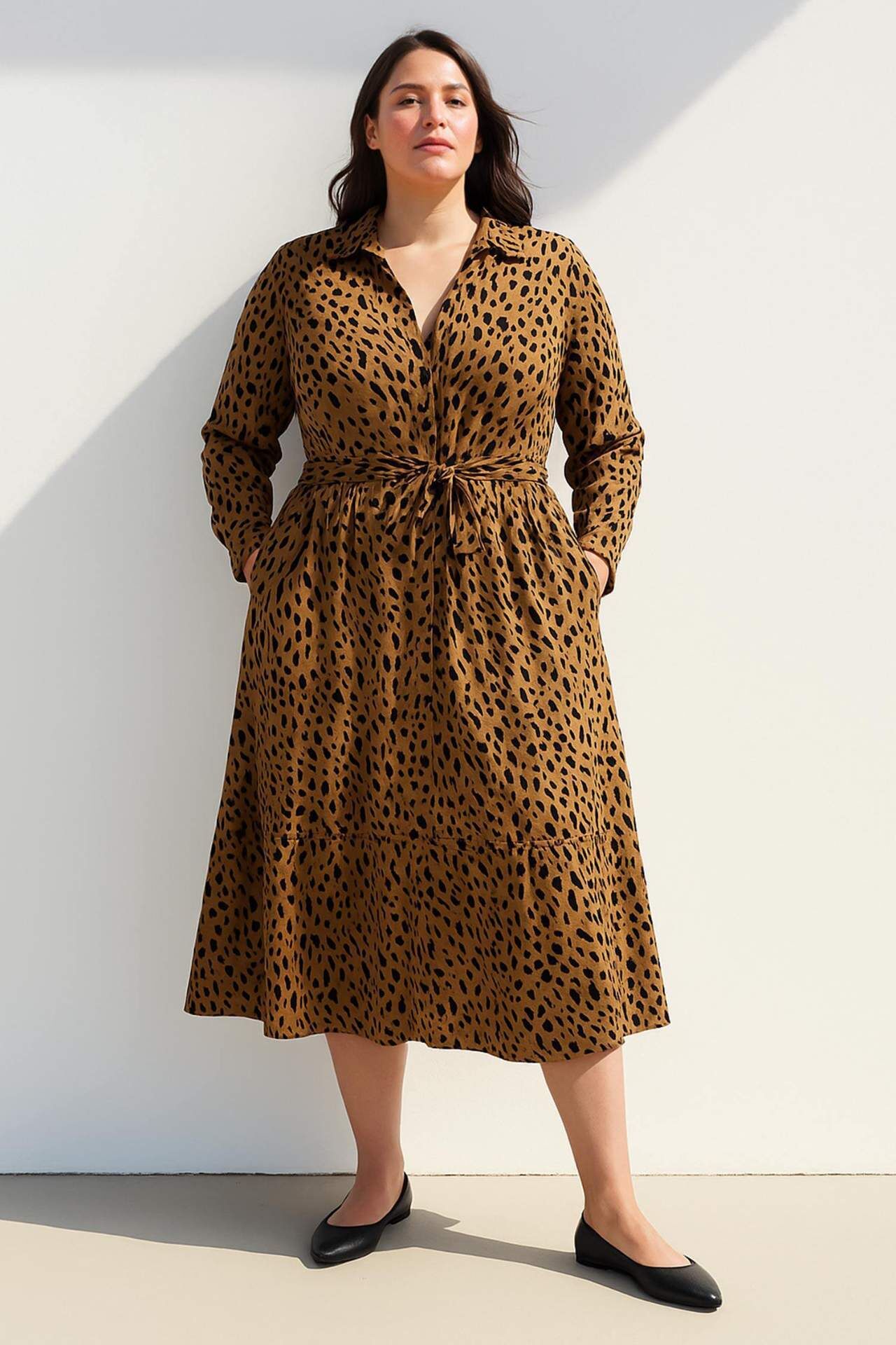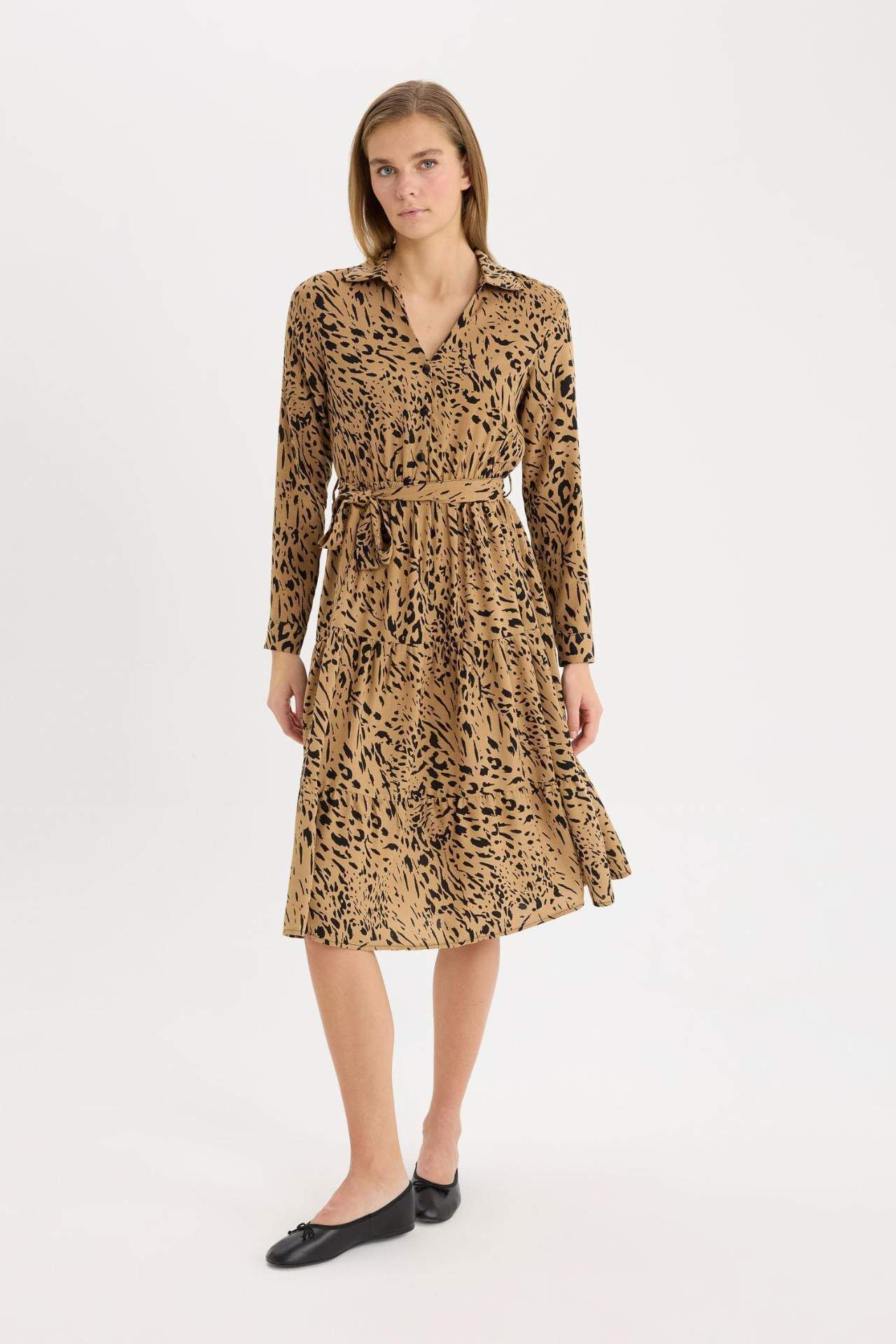Gömlek Yaka Leopar Desenli Uzun Kollu Kuşaklı Midi Elbise